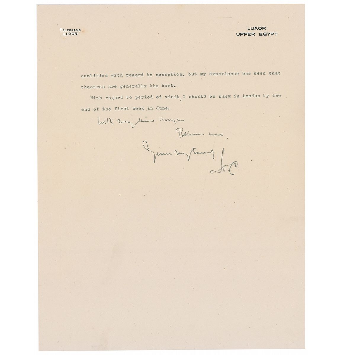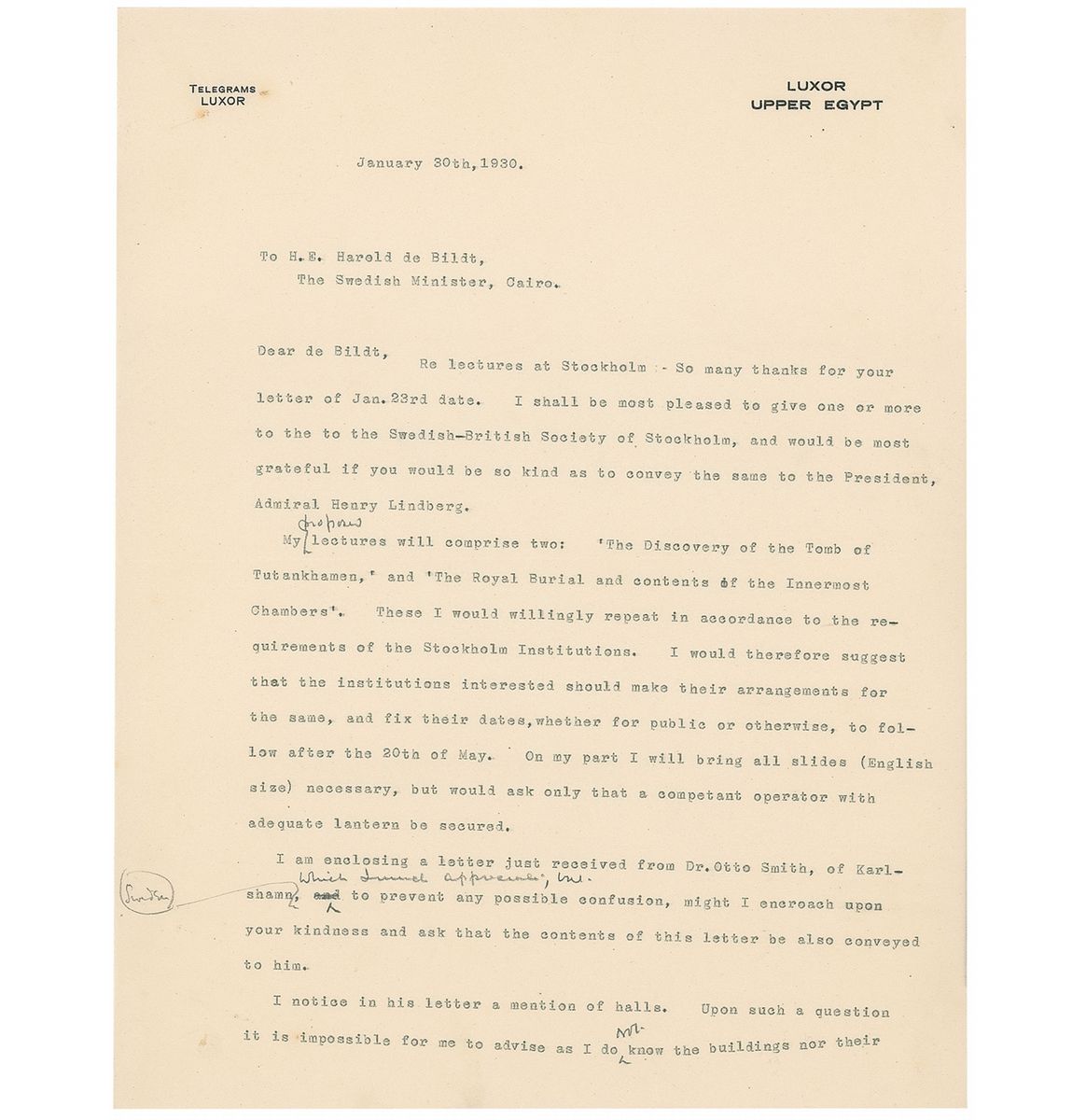 British archaeologist and Egyptologist (1874–1939) whose discovery of the tomb of Tutankhamun in Egypt’s ‘Valley of the Kings’ proved to be one of the signal events in the history of archaeology. TLS signed in pencil, “H. C.,” two pages, 8.25 x 10.5, Luxor letterhead, January 30, 1930. Letter to H. E. Hareld de Bildt, the Swedish minister to Cairo. In part: “Re lectures at Stockholm…I shall be most pleased to give one or more to the Swedish-British Society of Stockholm…My proposed lectures will comprise two: ‘The Discovery of the Tomb of Tutankhamen,’ and ‘The Royal Burial and contents of the Innermost Chambers’…On my part I will bring all slides (English size) necessary, but would ask only that a competent operator with adequate lantern be secured.” Carter adds a number of pencil corrections in his own hand throughout the letter. In fine condition.