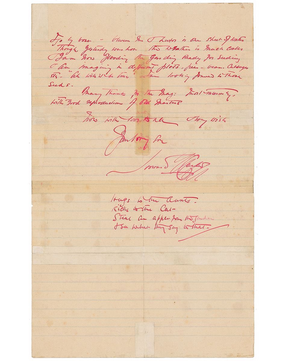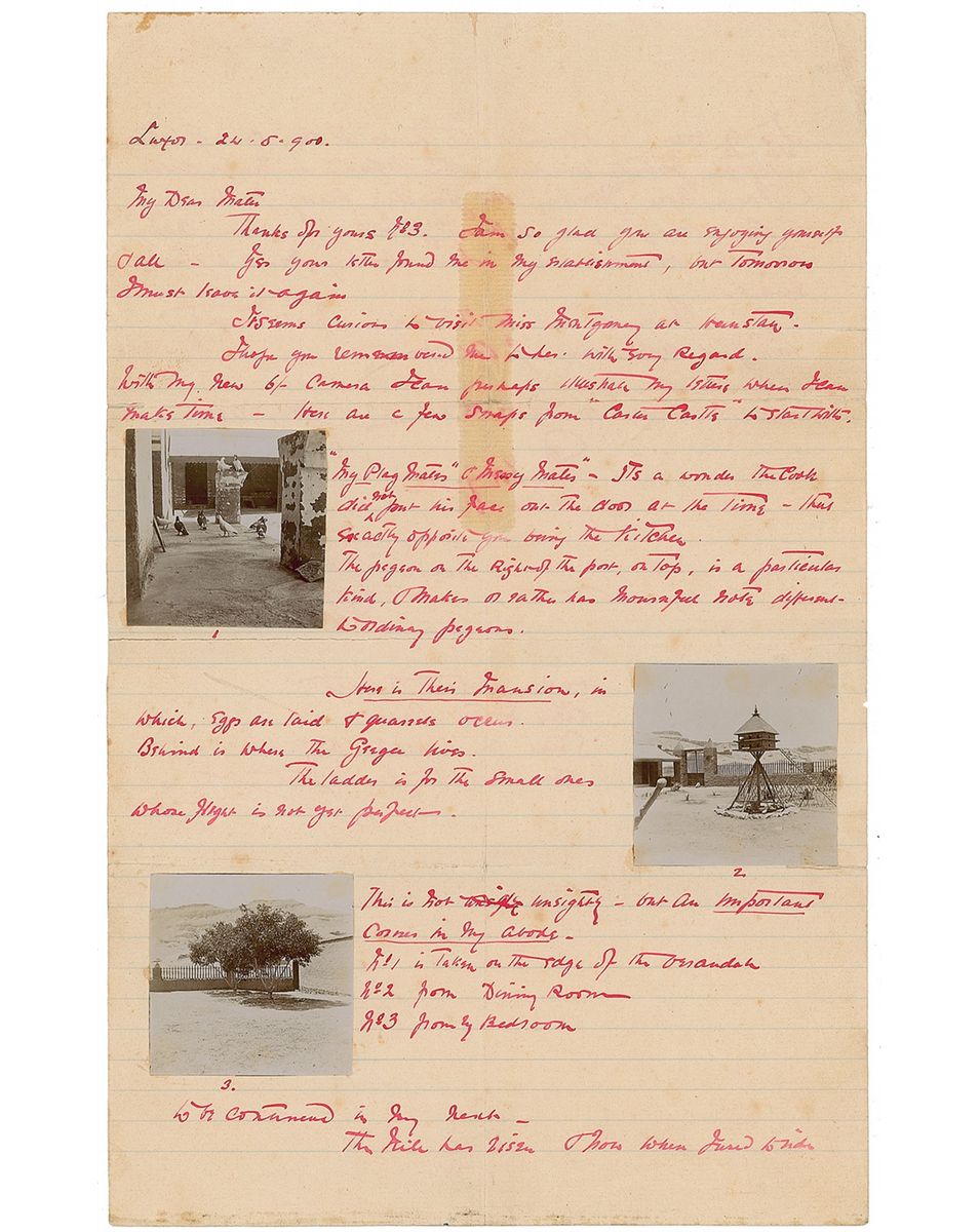 Extraordinarily rare ALS, one page, lightly-lined both sides, 8.5 x 13.25, Luxor, Egypt, May 24, 1900. Letter to his mother, “Dear Mater.” In part: “I am so glad you are enjoying yourself & all—yes your letter found me in my establishment, but tomorrow I must leave it again…With my new 6/- camera I can perhaps illustrate my letters when I can make time—Here are a few snaps from ‘Carter Castle’ to start with. [Affixed photo of a flock of pigeons]. ‘My Play Mates & Messy Mates’—It’s a wonder the cook did not put his face out the door at the time—that exactly opposite you being the kitchen. The pigeon on the right of the post, on top, is a particular kind, & makes or rather has mournful note different to ordinary pigeons. Here is their mansion, in which, eggs are laid & quarrels occur…The ladder is for the small ones whose flight is not yet perfect. [Affixed photo of a birdhouse with ladder]. [Affixed photo of trees]. This is not unsightly—but an important corner in my abode…The Nile has risen…between me & Luxor is one sheet of water. Though yesterday was hot the weather is much cooler & I am now…ready for seeding & am imagining in different plots, peas, beans, cabbages, etc…I am looking forward to those seeds.” Carter has signed in full at the conclusion, “Howard Carter,” and then scribbled out his last name—likely to make it more informal. In a brief postscript, Carter has penned a poem: “Hugs to the aunts / Kicks to the cat / Steal an apple from the garden / & see what they say to that.” Each affixed photo measures 2.25 x 2.25. Intersecting folds, most with partial tape-repaired separations, areas of toning due to affixed tape, light scattered foxing, and a few light creases to corners, otherwise very good condition.