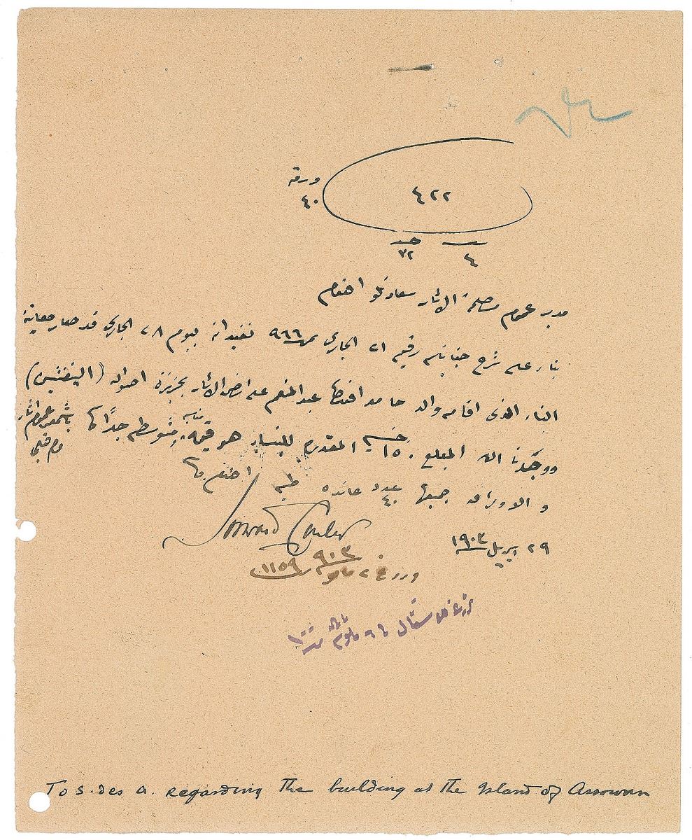Rare manuscript DS in Arabic, one page, 6.75 x 8.25, received May 2, 1903. Document directed to the director of the General Archaeology Directorate, in part (translated): “Based on your explanation, dated the 21st of this month, number 966, we inform you that an inspection has been conducted of the building constructed by the father of Hamid Effendi Abdulmunim at the archaeological site on the island Aswan (Elephantine). We found that the amount of 150 Egyptian pounds estimated for the building is a very appropriate and reasonable value…The total number of pages are back.” Ink notations along bottom in another hand. In fine condition, with two punch holes to left edge, and several staple-related holes to the top margin. In 1903, Carter transferred to the Inspectorate of Lower and Middle Egypt and set up headquarters at Saqqara. His time excavating at Aswan with the likes of Lady William Cecil Amherst proved relatively unsuccessful, with the exception of a discovery of ancient Aramaic papyri made by several sebakh workers. A rare letter from the famed archeologist, immersed in his life along the Nile River and still years away from his unearthing of King Tut.