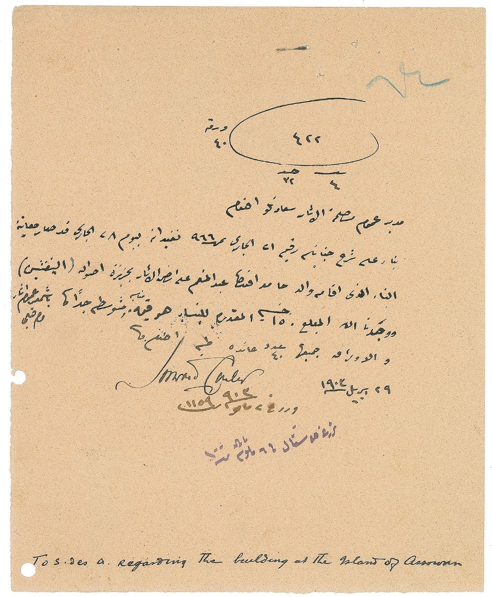Rare manuscript DS in Arabic, one page, 6.75 x 8.25, received May 2, 1903. Document directed to the director of the General Archaeology Directorate, in part (translated): "Based on your explanation, dated the 21st of this month, number 966, we inform you that an inspection has been conducted of the building constructed by the father of Hamid Effendi Abdulmunim at the archaeological site on the island Aswan (Elephantine). We found that the amount of 150 Egyptian pounds estimated for the building is a very appropriate and reasonable value…The total number of pages are back." Ink notations along bottom in another hand. In fine condition, with two punch holes to left edge, and several staple-related holes to the top margin. In 1903, Carter transferred to the Inspectorate of Lower and Middle Egypt and set up headquarters at Saqqara. His time excavating at Aswan with the likes of Lady William Cecil Amherst proved relatively unsuccessful, with the exception of a discovery of ancient Aramaic papyri made by several sebakh workers. A rare letter from the famed archeologist, immersed in his life along the Nile River and still years away from his unearthing of King Tut. Pre-certified PSA/DNA.