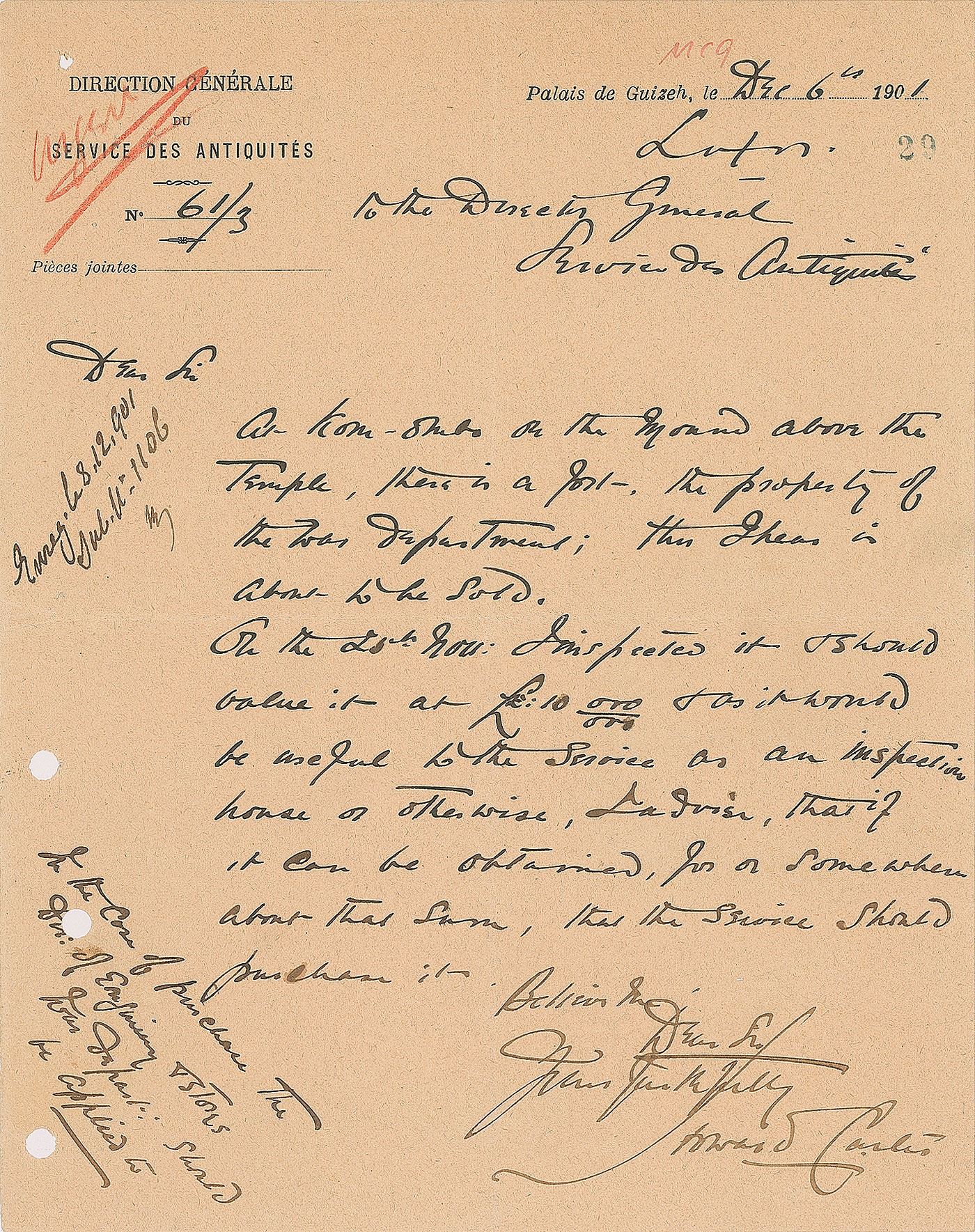 British archaeologist and Egyptologist (1874–1939) whose discovery of the tomb of Tutankhamun in Egypt's 'Valley of the Kings' proved to be one of the signal events in the history of archaeology. ALS signed “Howard E. Carter,” one page, 7 x 9, Direction Generale du Service des Antiquites letterhead, December 6, 1901. In part: "At Kom-Ombo on the mound above the Temple, there is a fort. The property of the War Department; this I hear is to be sold. On the 25th Nov. I inspected it & should value it at £10,000 & as it would be useful to the Service as an inspection house or otherwise, I advise, that if it can be obtained, for or somewhere about that sum, that the service should purchase it." In fine condition, with four punch holes to the left side. A fascinating letter as Carter references the famous Temple of Kom Ombo, an unusual double-temple of the Ptolemaic dynasty which was dedicated to both the crocodile god Sobek and the falcon god Horus. This is also a scarce format as one of only a few autograph letters by Carter that we have encountered.