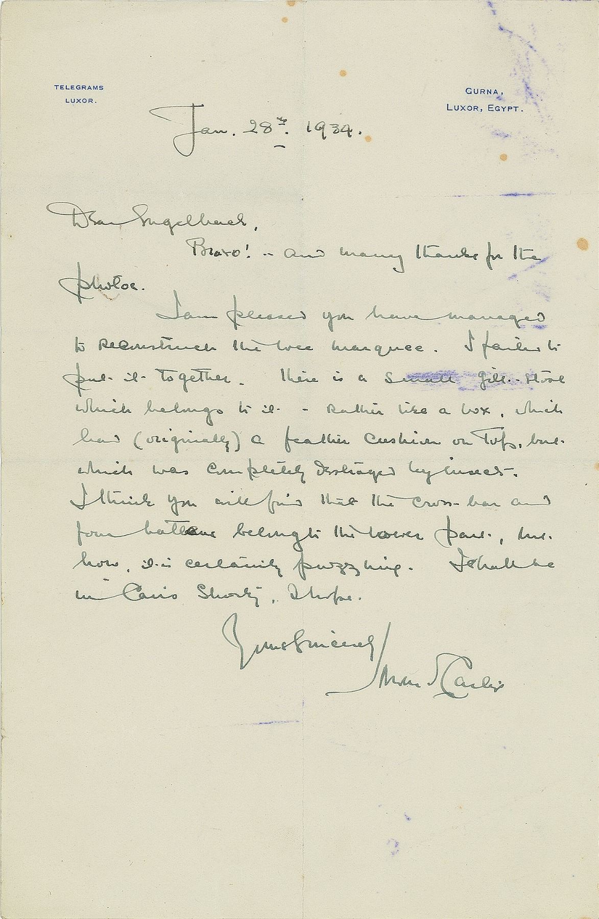 British archaeologist and Egyptologist (1874–1939) whose discovery of the tomb of Tutankhamun in Egypt's 'Valley of the Kings' proved to be one of the signal events in the history of archaeology. ALS, one page, 7 x 10.75, Luxor letterhead, January 28, 1934. Letter to fellow archaeologist Reginald Engelbach, in part: "I am pleased you have managed to reconstruct the tree marquee. I failed to put it together. There is a small gill-stone which belongs to it. Rather like a box, which had (originally) a feather cushion on top, but which was completely destroyed by insects. I think you will find that the crow-bar and four buttons belong to the lower part, but how, it is certainly puzzling. I shall be in Cairo shortly, I hope." In very good condition, with overall creasing and some scattered light staining. Fascinating content from history's most famous archaeologist, written to an important fellow Egyptologist—Engelbach is remembered for his compilation of a register of all artifacts belonging to the Egyptian Museum of Cairo.
