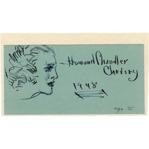 <B>Howard Chandler Christy Original Ink Sketch Signed</B></I> in full on a blue card, 6" x 3", 1948. An American artist and illustrator, Christy (1873-1952) is famous for his "Christy Girl," a romanticized image of the contemporary society woman. His work was published in many popular magazines and books, and his World War I recruiting posters are among the finest of the period. His painting, <I>Scene at the Signing of the Constitution of the United States,</B></I> is one of the most dramatic and best known depictions of the American Revolution. It currently is displayed in the U.S. Capitol building. Very fine condition.<BR><BR><b>Shipping:</b> Flat Material, Small (<a target="_blank" href="http://www.heritageauctions.com/common/shipping.php">view shipping information</a>)