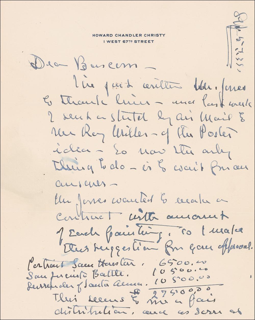 Between 1905 and the beginning of World War I, Christy was one of the most popular artists in America, creating the iconic ‘Christy Girl’ and five years after this letter was sent, a famed representation of the signing of the US Constitution. The Great Depression put a damper on his life but did not diminish his work load—whether for pleasure or for pay. As evidenced here, the creation of three works commemorating the Alamo would be quite profitable for the artist—especially during the economically depressed period.