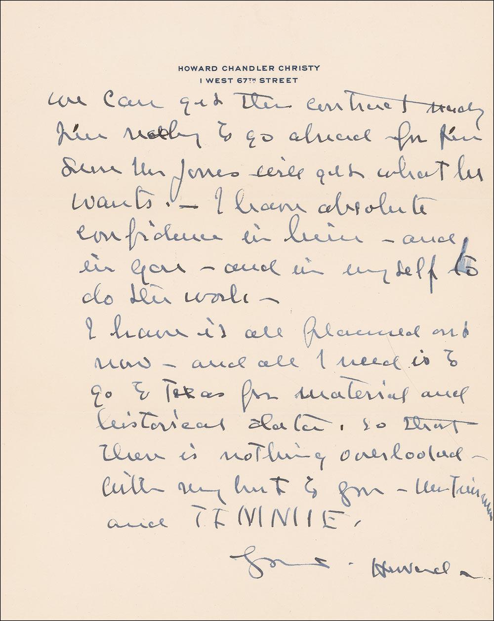 This seems to me a fair distribution, and as soon as we can get the contract ready I’m ready to go ahead for I’m sure Mr. Jones will get what he wants. I have absolute confidence in him–and in you–and in myself to do the work. I have it all planned out now–and all I need is to go to Texas for material and historical data, so that there is nothing overlooked–with my very best to you Mr. Timmons and Timmie.” In fine condition, with a couple brushes to a couple letters of text, not affecting legibility. Accompanied by the original mailing envelope addressed in Christy’s hand.