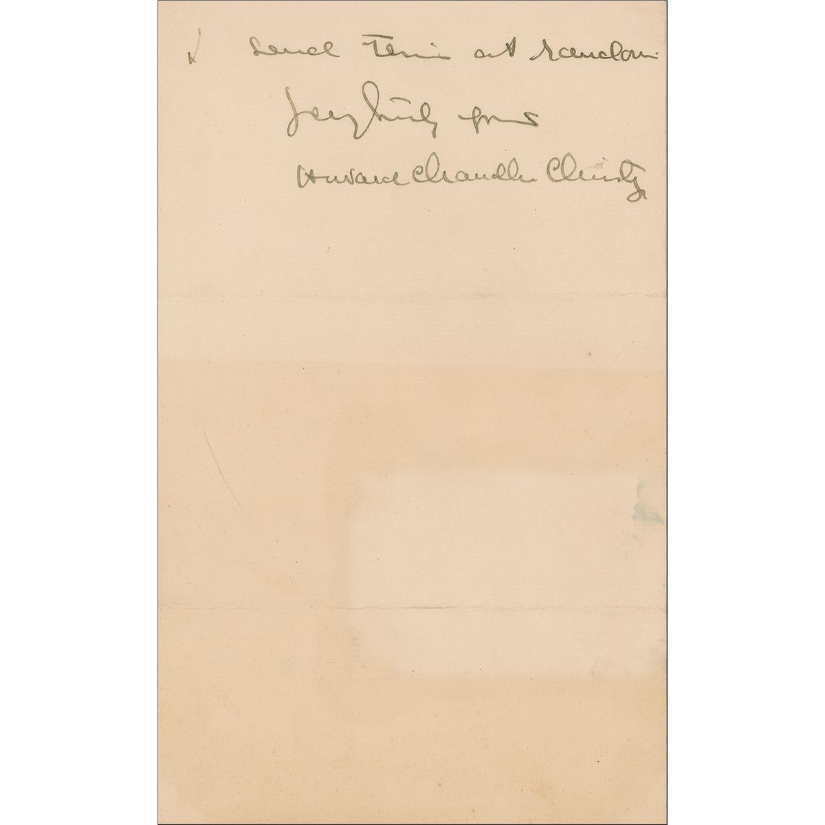 Illustrator and painter who developed the popular image of the Christy Girl. ALS, two pages on two adjoining sheets, 9.75 x 8, The Barracks letterhead, October 13, 1909. In a letter to an admirer, Christy writes, in full: “I find your stamped and addressed envelope among my unanswered letters, and cannot find the letter which should accompany it. So I do not know what your request is, but as I get a great many requests for autographs, I send this at random.” In very good condition, with a uniform shade of toning, with two blocks of lighter toning on the second integral page, and some light scattered creasing and soiling.