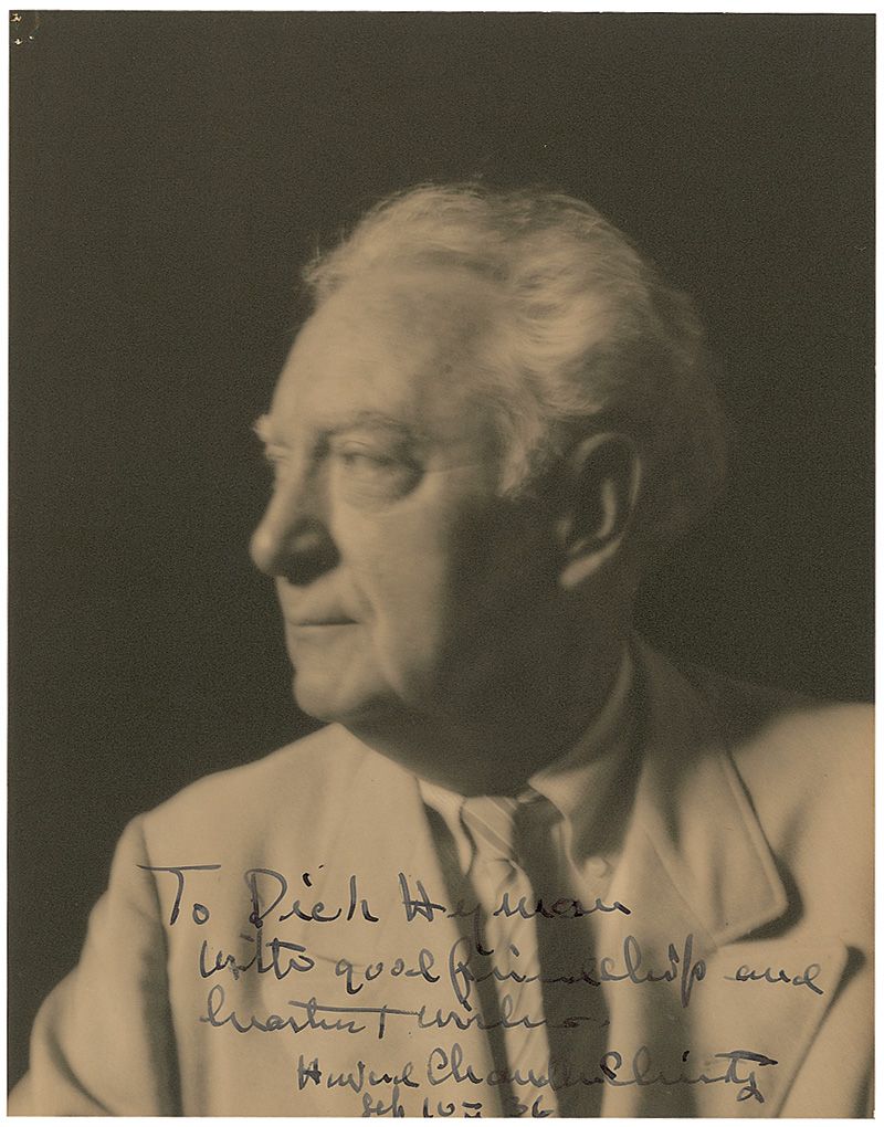 Vintage matte-finish 7.25 x 9.25 photo, signed and inscribed in fountain pen “To Dick Hyman with good friendship and heartiest wishes, Howard Chandler Christy Sep 10th 36.” Reverse bears a short note from Christy, signed “Howard,” apologizing for the delay in returning the photo. Lightly trimmed edges, a tack hole to top left, and some light contrast to portion of signature and inscription, otherwise fine condition.