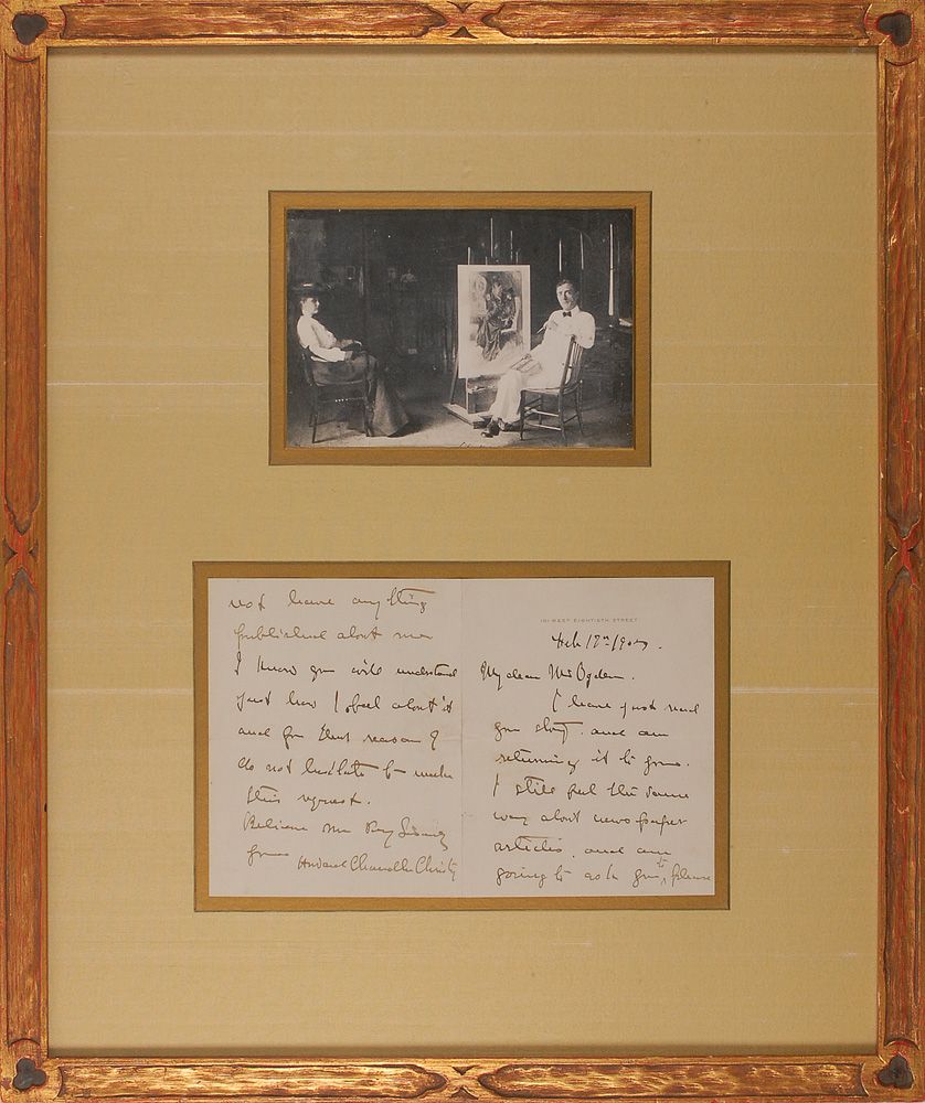 Illustrator and painter (1873–1952) who developed the popular image of the Christy Girl. ALS, one page, 5 x 6.5, February 12, 1907. Letter to “Ms. Ogden.” In full: “I have just read your story and am returning it to you. I still feel the same way about newspaper articles, and am going to ask you to please not have anything published about me. I know you will understand just how I feel about it and for that reason I do not hesitate to make this request.” Mounted and framed with a portrait of Christy to an overall size of 18.75 x 22.5. In fine condition, with mild scattered soiling.