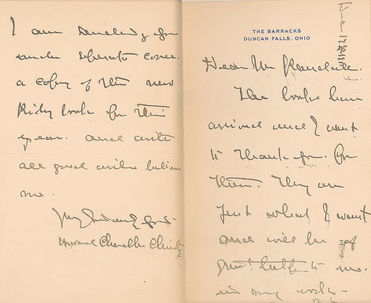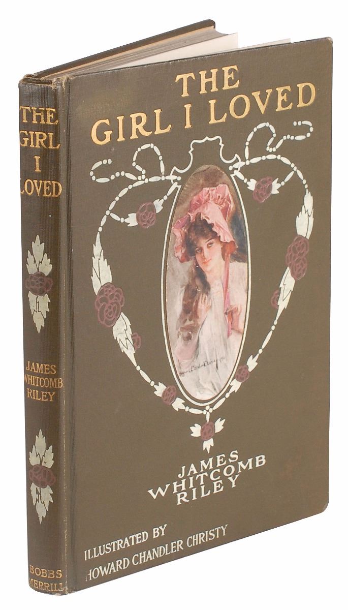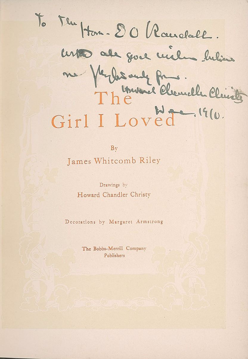 Signed book: The Girl I Loved. First edition. Indianapolis: The Bobbs-Merrill Company, 1910. Hardcover, 6.5 x 8.75. Signed and inscribed on the title page in fountain pen, “To the Hon. E. O. Randall, with all good wishes…Howard Chandler Christy, Dec. 1910.” An ALS is affixed to the first free end page, two pages on two adjoining sheets, December 17, 1910, in part: “The books have arrived and I want to thank you for them…I am sending you…a copy of the new Riley book for this year.” Light foxing to free end pages, brushing to one word in the inscription, and a crease to the letter, otherwise fine condition.