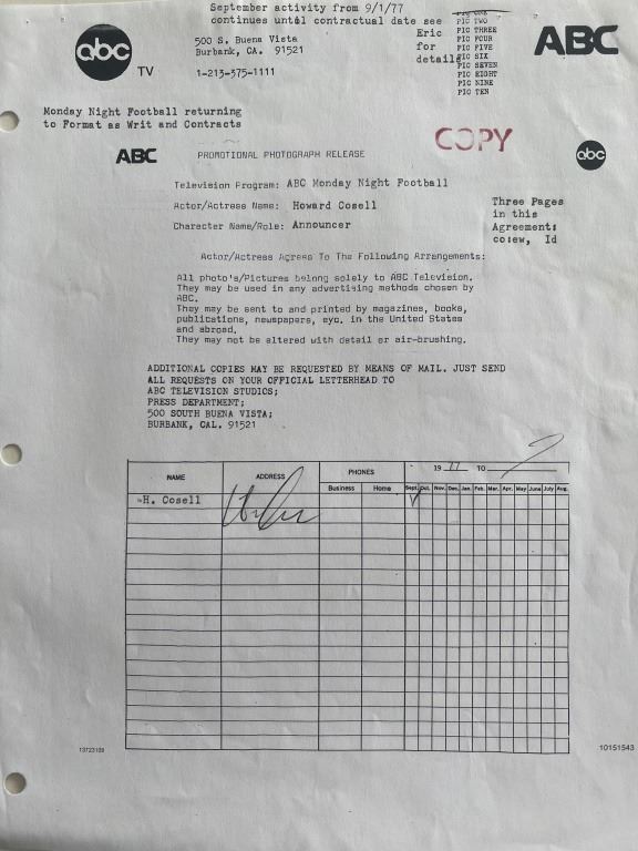 Howard Cosell signed 1977 ABC contract. 8x11 inches. DB360