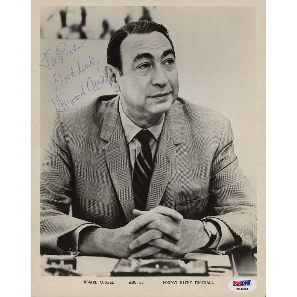 Desirable glossy 8 x 10 promo photo for Monday Night Football, signed and inscribed in blue ballpoint, "To Parker, Good luck, Howard Cosell." In fine condition, with a PSA/DNA label affixed to the lower right corner (certificate of authenticity not present).