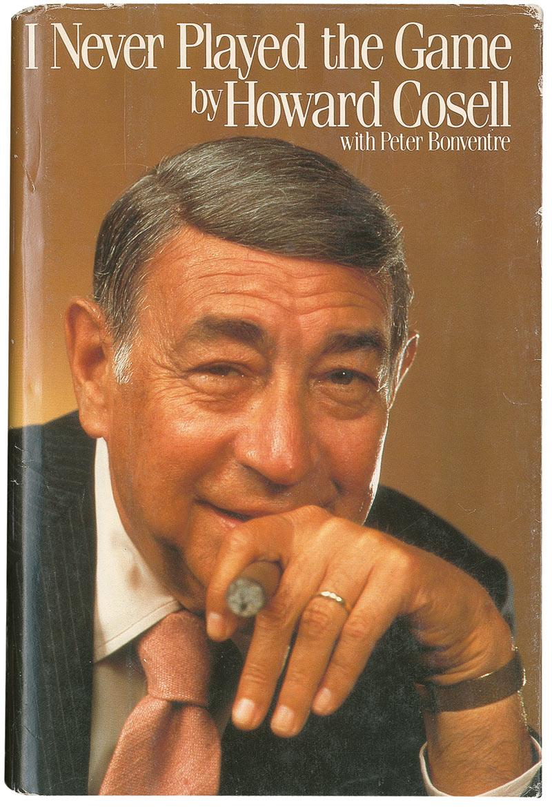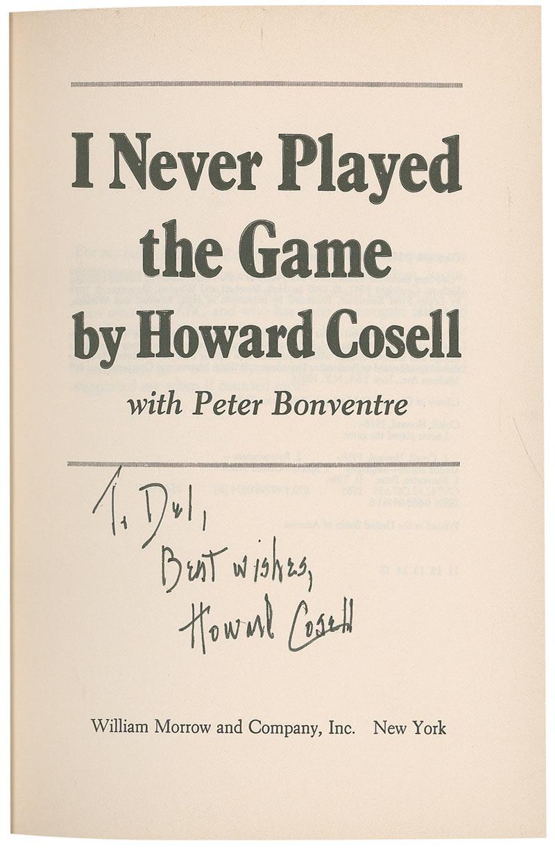 Signed book: I Never Played the Game. Later printing. NY: William Morrow and Company Inc., 1985. Hardcover with dustjacket, 6.25 x 9.5, 380 pages. Signed and inscribed on the title page, “To Del, Best wishes, Howard Cosell.” Uniform toning to all pages, and scattered edge wear and creasing to dustjacket, otherwise fine condition.