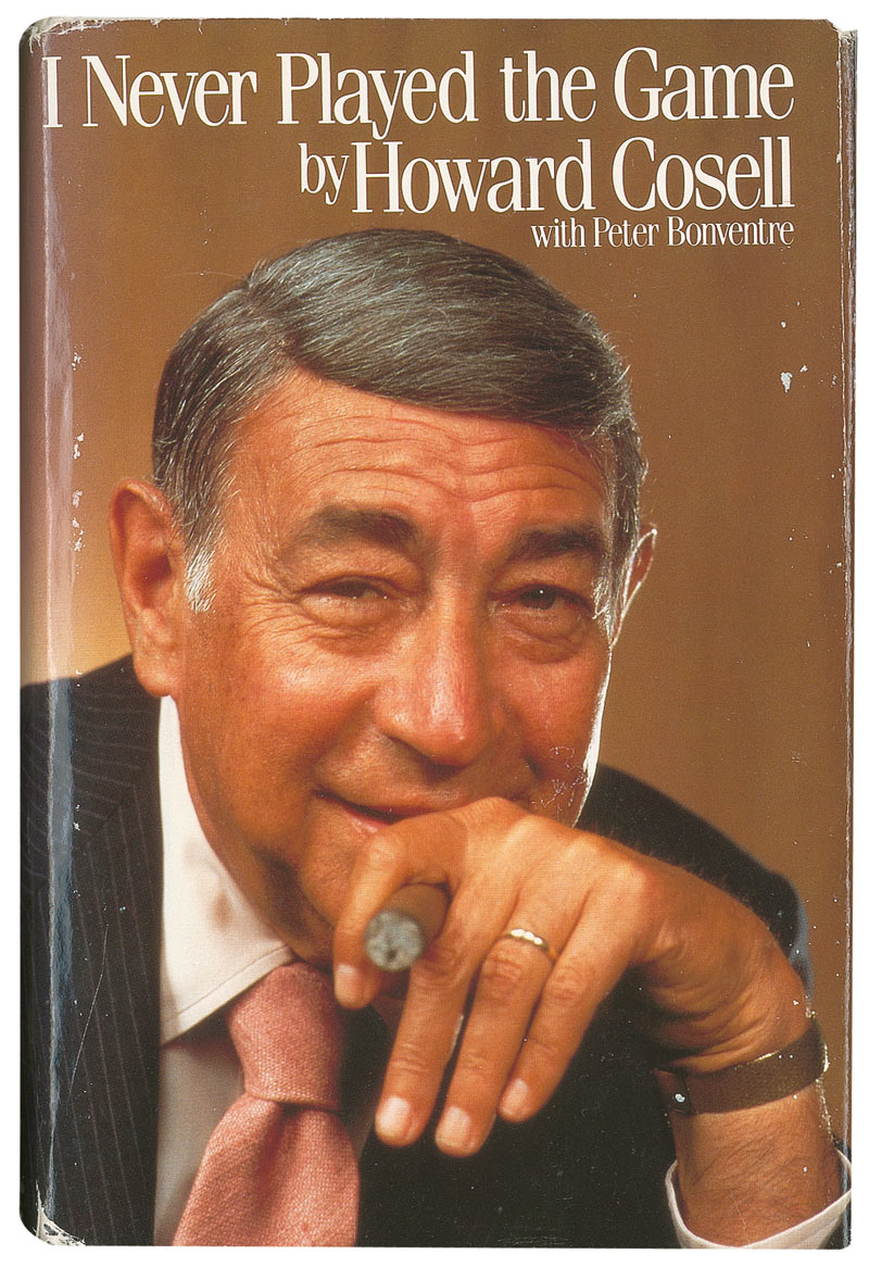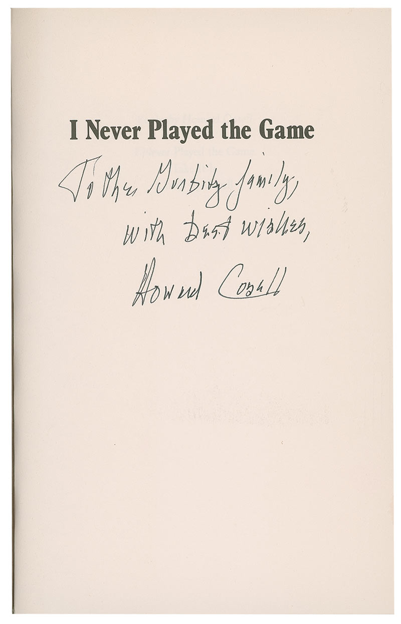 Signed book: I Never Played the Game. First edition, first printing. NY: William Morrow and Company, Inc., 1985. Hardcover with dustjacket, 6.25 x 9.5, 380 pages. Signed and inscribed in black ink on the half-title page, “To the Gunbity family with best wishes, Howard Cosell.” Light scattered soiling to the end pages and mild scuffing and chipping to the dustjacket, otherwise fine condition.