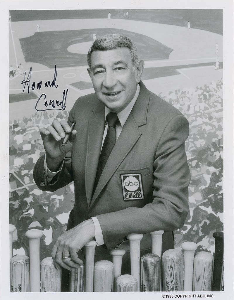 Glossy 7 x 9 ABC promotional photo for Monday Night baseball, signed in black felt tip. Promotional information is affixed to the reverse. In fine condition, with a couple trivial edge creases.