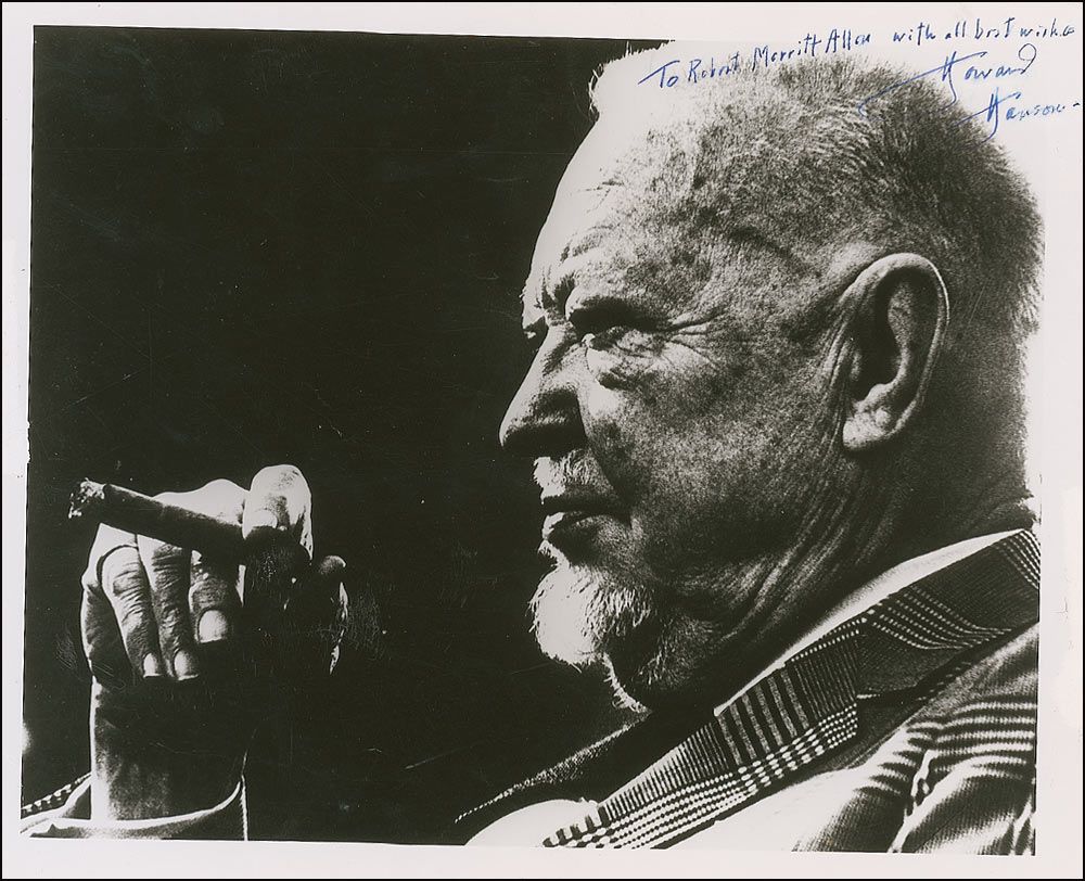 Composer, conductor, and musical theorist (1896–1981) who was winner of the Rome, Pulitzer, and Peabody awards. Glossy 10 x 8 photo, signed and inscribed in blue ink “To Robert Merritt Alton, with all best wishes, Howard Hanson.” Some scattered light creases and surface marks, surface loss to both edges, and a few brushes to signature, otherwise fine condition.