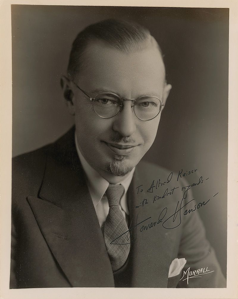 Composer, conductor and musical theorist (1896–1981) who was winner of the Rome, Pulitzer, and Peabody awards. Vintage 8 x 10 photo, signed and inscribed in fountain pen “To Alfred Kaiser, with kindest regards—Howard Hanson.” Three diagonal surface impressions through portions of signature and inscription, a few light surface marks and creases, and a bit of scattered light silvering, otherwise fine condition.