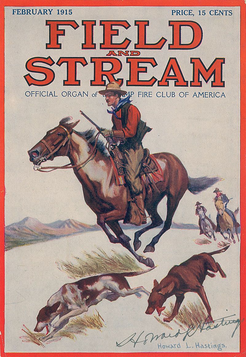 Early 20th century illustrator known for his outdoor scenes. Field and Stream magazine cover, dated February 1915, featuring one of Hastings’s hunting scenes, 5.75 x 8.5, signed in the lower right in black ink, “Howard L. Hastings.” Affixed at the top to a slightly larger cardstock sheet. In fine condition, with light scattered creases and trivial haloing to the signature.