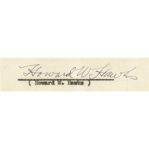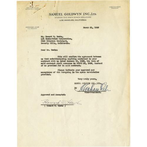 <B>Howard Hawks Signed Contract.</B></I> In a career of over 40 years, Howard Hawks directed such classics as <I>The Dawn Parol</B></I> (1930), <I>Scarface</B></I> (1943), <I>To Have and Have Not</B></I> (1944), <I>Red River</B></I> (1948) and <I>Gentlemen Prefer Blondes</B></I> (1952). This single-page agreement on Samuel Goldwyn letterhead dated March 31, 1936, is signed by the legendary director in black ink. The contract relate to the film <I>Come and Get It</B></I> (1936); during its shooting, Hawks battled producer Goldwyn and left the picture, which was finished by William Wyler. Fine to Very Fine condition with mild to moderate tanning, mailing creases, and rusty staple imprints.<I>Accompanied by LOA from PSA/DNA.</B></I><BR><BR><b>Shipping:</b> Small Flat (<a target="_blank" href="http://www.heritageauctions.com/common/shipping.php">view shipping information</a>) <BR><BR><B>Important notice: