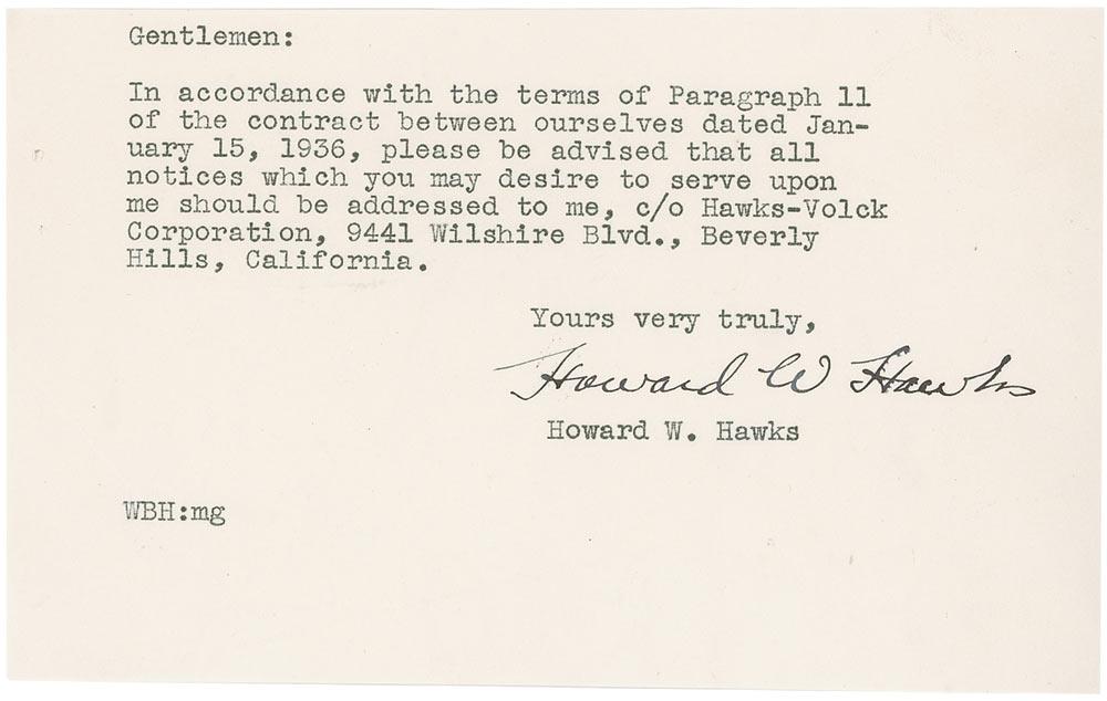 TLS, one page, 6.5 x 4. In full: “In accordance with the terms of Paragraph 11 of the contract between ourselves dated January 15, 1936, please be advised that all notices which you may desire to serve upon me should be addressed to me, c/o Hawks-Volck Corporation, 9441 Wilshire Blvd., Beverly Hills, California.” Some scattered light creasing and wrinkles, and staple hole to the left edge, otherwise fine condition.