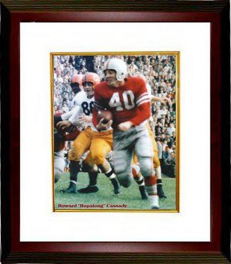 Hopalong Cassady played for the Ohio State Buckeyes from 1952-55. During his college career, he scored 37 touchdowns in 36 games. He also played defensive back; a pass was never completed on him in his four years at the university. In 1955, Cassady won the Heisman Trophy (by the largest margin at the time), the Maxwell Award, and was named the Associated Press Athlete of the Year. This is a Color unautographed 8x10 Photo of Ohio State Buckeyes Heisman Trophy Winner Hopalong Cassady. Custom White Mat and Premium Mahogany Frame as shown.