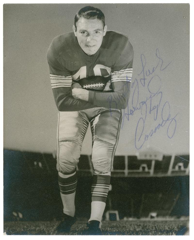 College Football Hall of Famer and winner of the 1955 Heisman trophy. Matte-finish 4 x 5 photo of Cassady in his uniform, signed in blue ballpoint, “Best of luck, Hopalong Cassady.” In very good condition, with mild rippling to left edge, scattered silvering to darker areas, and a few creases.