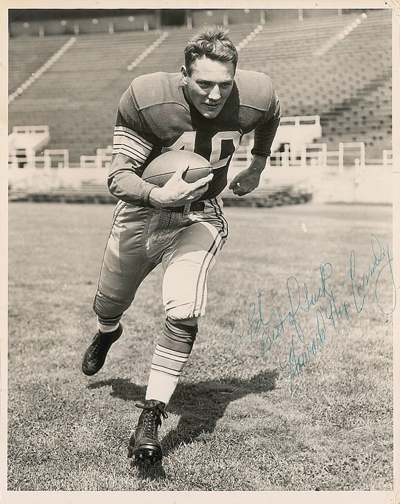 Glossy 7.75 x 10 photo of Cassady in a running pose, signed and inscribed in blue ballpoint, “To Ed, Best of luck, Howard ‘Hop’ Cassady.” In very good condition, with scattered creases and crazing to the emulsion, light rippling to top edge, a small tear to right border (slightly affecting signature), and irregularly trimmed left and right edges.