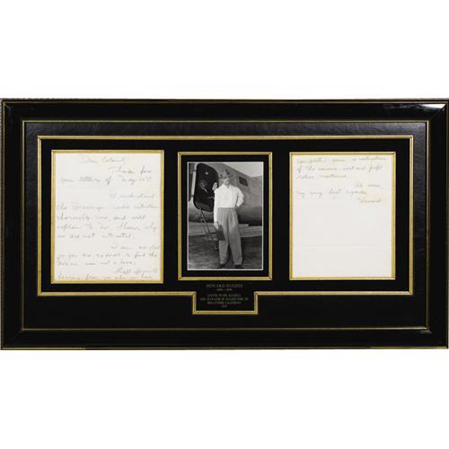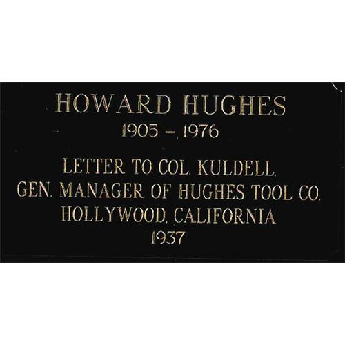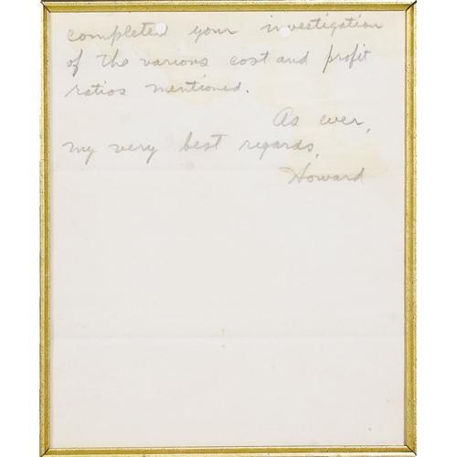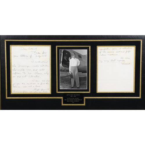 <B>Howard Hughes Handwritten Letter Display.</B></I> A two-page, handwritten letter in pencil to Colonel Robert C. Kuldell, the general manager of Hughes Tool Co., circa 1937, signed by Hughes. It reads: "Dear Colonel, Thanks for your letter of May 10th. I understand the Brewery radio situation thoroughly now, and will explain to Mr. Shurr why we are not interested. I am as glad as you are, no doubt, to find the $340,000 was not a loss. Shall appreciate hearing from you when you have completed your investigation of the various cost and profit ratios mentioned. As ever, my very best regards, Howard." The letter is in Very Fine condition with fold creases and mild staining and binder holes to the top of the second page. It has been matted and framed along with a b&w 8" x 10" photo of Hughes (with a Hughes Aircraft stamp en verso) to an overall size of 35" x 20". <I>Accompanied by LOA from PSA/DNA.</B></I><BR><BR><b>Shipping:</b> Framed - with Glass, Small (<a target="_blank" href="http://www.heritageauctions.com/common/shipping.php">view shipping information</a>)