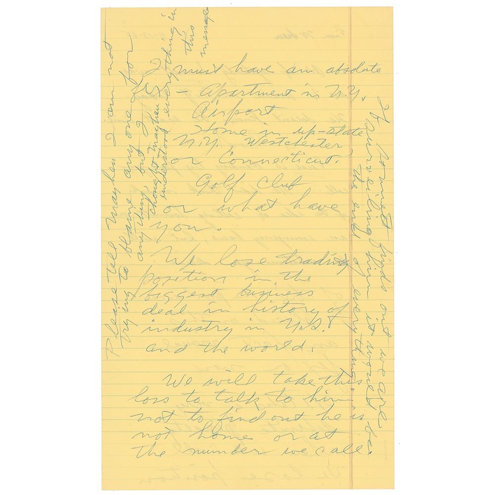 Below, Hughes jots his notes on the matter: "& Cook. Of the importance I placed on this an exact visual fix on now. We take a definite penalty when we call. We lose a position. I must have an absolute fix-Apartment in N.Y. Airport. Home in up-state N.Y., Westchester, or Connecticut. Golf Club or what have you. We lose trading positions in the biggest business deal in history of industry in U.S. and the world. We will take this loss to talk to him not to find out he is not home or at the number we call. Please tell Mayheu I am not trying to blame anyone for anything, but I thought Mayheu understood everything in this message. If Sonnett finds out we are surveilling him it would be the end of everything." In fine condition.