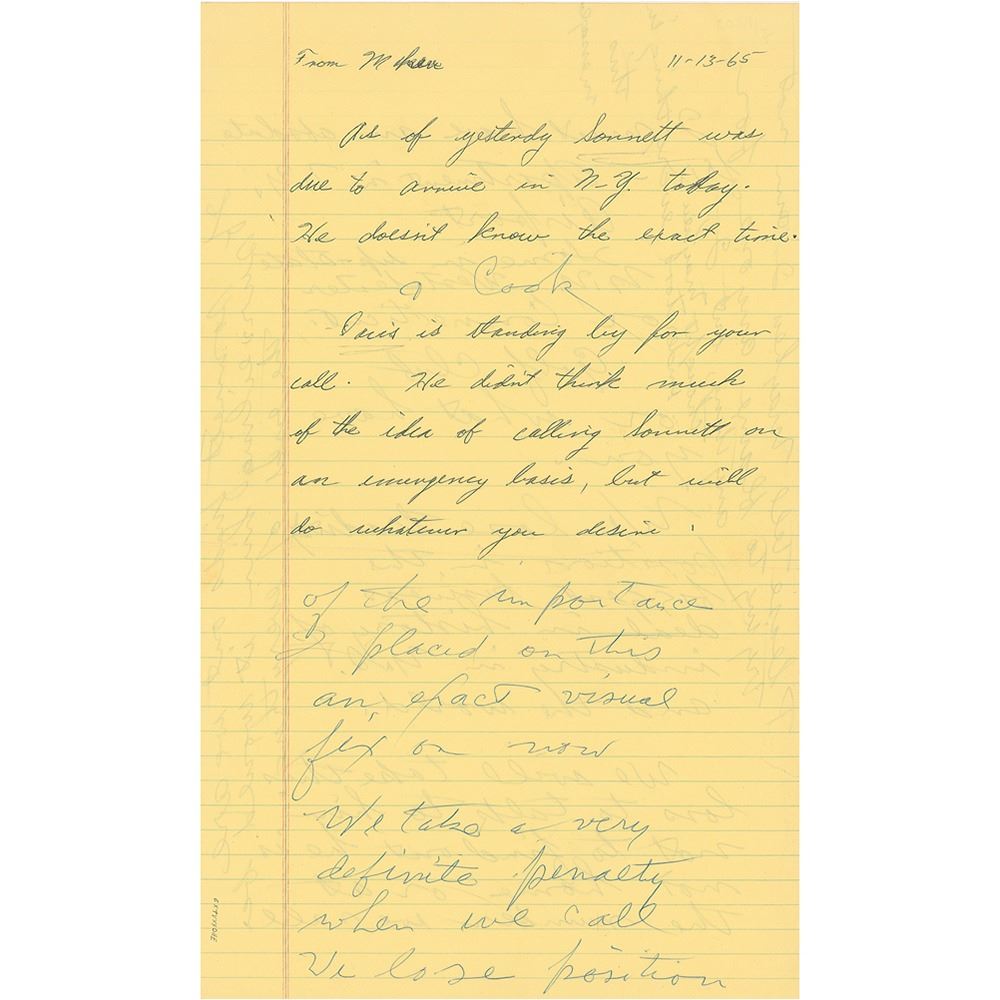 Intriguing unsigned handwritten notes by Howard Hughes, one page both sides, 8.5 x 14, November 13, 1965. The uppermost portion is written in a secretarial hand, "From Maheu," referring to ex-FBI and CIA operative Robert H. Maheu, who acted on behalf of Howard Hughes to thwart blackmailers, spy on enemies and ingenues, and conduct other covert business: "As of yesterday Sonnett was due to arrive in N.Y. today. He doesn't know the exact time. Davis is standing by for your call. He didn't think much of the idea of calling Sonnett on an emergency basis, but will do whatever you desire."