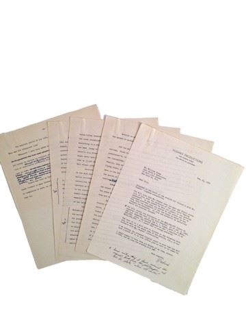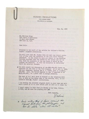 Original Collier's Article with Howard Hughes handwritten, longhand revisions on Hughes Productions stationery, addressed to Mr. William Utley at Carl Byoir & Associates in New York City, signed by Nadine Henly (a confidant and friend of Howard Hughes), and dated Feb. 24, 1950. The draft is 5 pages long. Includes a copy of the letter of provenance which is a letter to a Karen from a writer and Howard Hughes obsessionist named Arelo who gifted her a collection of photos and autographs of Howard Hughes based on her interest in collecting.