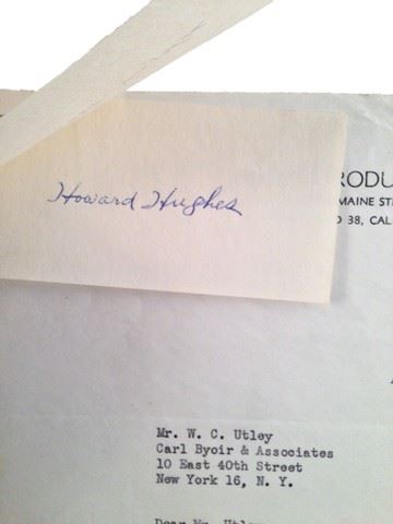 Howard Hughes original, full name autographs stapled to Hughes Productions stationery paper dated Aug. 15, 1947. The letter states: Mr. Hughes asked that a sample of his signature be sent to you for use in answering letters regarding the recent hearings. Very truly yours, Marian Miller. This was sent to Mr. W.C. Utley of Carly Byoir & Associates in New York City. (2 signatures on paper stapled to each other measure 4"x2"). Includes a copy of the letter of provenance which is a letter to a Karen from a writer and Howard Hughes obsessionist named Arelo who gifted her a collection of photos and autographs of Howard Hughes based on her interest in collecting.