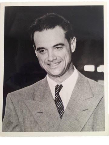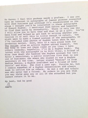 Original photo of Howard Hughes when he was producing motion pictures, wearing a sport jacket and polka dot tie (8"x10"). Includes a copy of the letter of provenance which is a letter to a Karen from a writer and Howard Hughes obsessionist named Arelo who gifted her a collection of photos and autographs of Howard Hughes based on her interest in collecting.