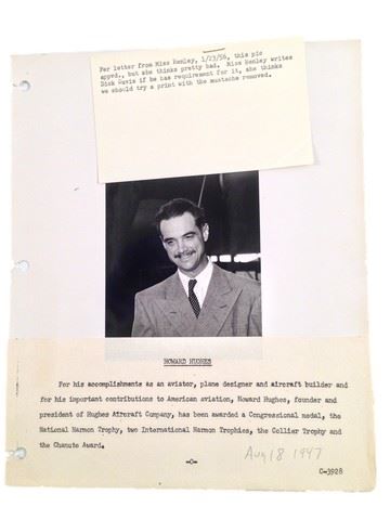 Howard Hughes original picture approval note with photo of him in sports jacket and polka dot tie. Includes stapled note dated 1/23/56 about the picture being approved and a note that they want to try a print with his mustache removed. At the bottom is a folded over note detailing Howard Hughes accomplishments and dated Aug 18, 1947. A Howard Hughes stamp is on the back of the words 'PHOTO' (8"x10"). Includes a copy of the letter of provenance which is a letter to a Karen from a writer and Howard Hughes obsessionist named Arelo who gifted her a collection of photos and autographs of Howard Hughes based on her interest in collecting.