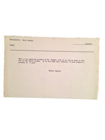 Howard Hughes picture approval note with photo of him in sports jacket as referenced in the note (photo is 8"x10"). Includes a copy of the letter of provenance which is a letter to a Karen from a writer and Howard Hughes obsessionist named Arelo who gifted her a collection of photos and autographs of Howard Hughes based on her interest in collecting.