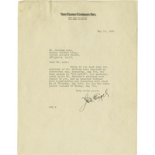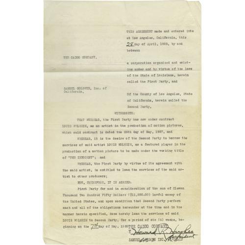 <B>Howard Hughes Signed Contract.</B></I> Howard Hughes was one of the most enigmatic personalities in U.S. history, and his "Caddo Company" produced early Hollywood classics, including <I>Hell's Angels</B></I> (1930). Louis Wolheim was a famed, rough-featured Broadway star who died shortly after making his best-remembered film, <I>All Quiet on the Western Front</B></I> (1930). This three-page agreement dated April 28, 1928, employs Wolheim to appear in a movie with the working title of <I>The Innocent,</B></I> signed in black ink by producer Hughes on the last page. The film was released as <I>The Awakening</B></I> in 1928 and received an Oscar nomination for Best Art Direction; no known print exists and it is now considered lost. Also included is a letter on Hughes' Caddo Company letterhead, dated May 12, 1928, and referencing the agreement, signed by Joseph W. Engel in black ink, citing Wolheim's work on <I>The Racket,</B></I> the first American gangster movie. All items are in overall Fine to Very Fine condition with mild to moderate tanning, some fold creases, and light wear.<I>Accompanied by LOA from PSA/DNA.</B></I><BR><BR><b>Shipping:</b> Small Flat (<a target="_blank" href="http://www.heritageauctions.com/common/shipping.php">view shipping information</a>) <BR><BR><B>Important notice:<