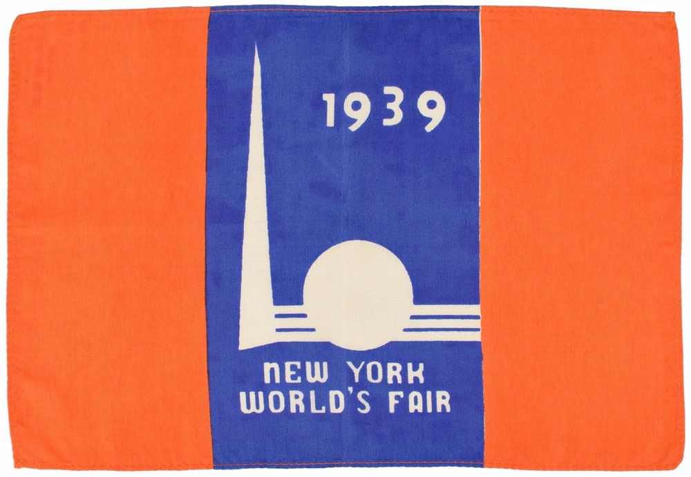 Exquisite grouping of items related to Howard Hughes and his 1938 round-the-world flight, including a signed menu, a flown airmail cover, and two flown flags: a program menu for a Houston banquet honoring Hughes upon his return, July 30, 1938, two pages, 6 x 8.75, signed inside in fountain pen by Hughes and his crew: "Harry Connor," "Howard Hughes," "Dick Stoddart," "Edward Lund," and "Tommy Thurlow"; a commemorative airmail postal cover carried on the flight, 9.5 x 4, issued in conjunction with the 1939 New York World’s Fair, bearing several postage stamps, postmarks, and rubber stamps indicating the primary stops on the record-setting journey: Paris, Moscow, Omsk, Yakutsk, Fairbanks, Minneapolis, and the final destination, New York City; a colorful 12 x 8.25 flag for the 1939 New York World's Fair, carried on the flight; and a 12 x 8 American flag carried on the flight. In overall very good to fine condition, with a central vertical fold to the menu and some scattered creasing (not affecting the signatures). Accompanied by a glossy 6.5 x 4.5 photo of Hughes at a Los Angeles press conference.