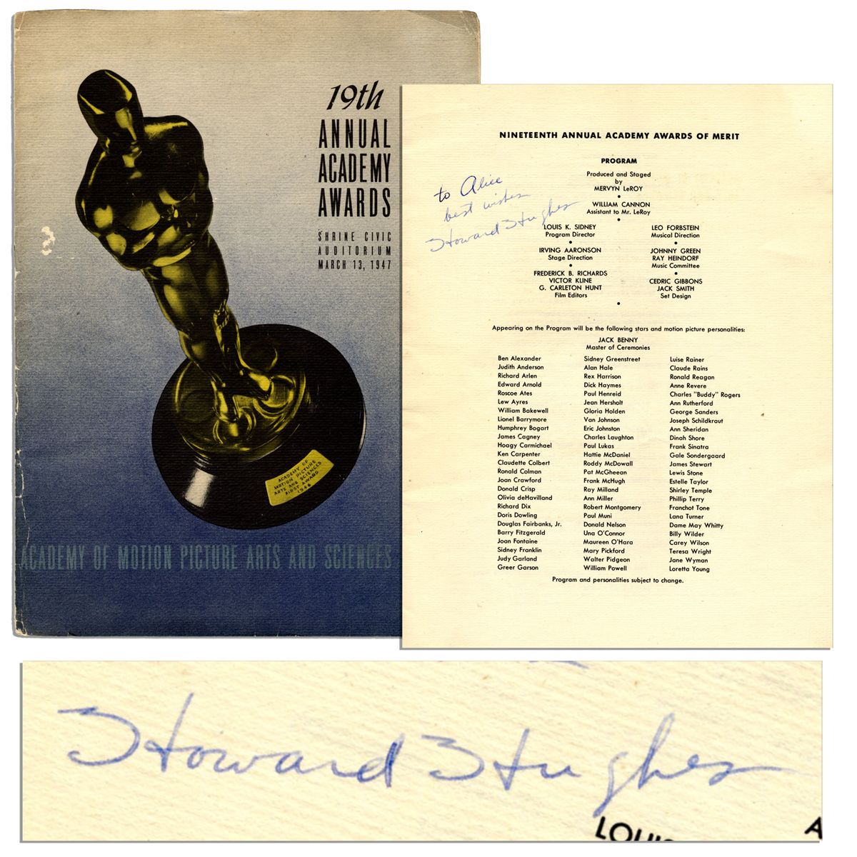 Howard Hughes signed Academy Awards program from the 19th Academy Awards in 1947. Program is inscribed upon the title page by the mogul in blue ink, reading, ''to Alice / best wishes / Howard Hughes''. Runs 8pp., listing the nominees in each category, among them famous winners ''It's a Wonderful Life'', ''The Yearling'', ''The Best Years of Our Lives'' and ''The Razor's Edge'' as well as heavyweight names Laurence Olivier, Anne Baxter, Lillian Gish, James Stewart and more. Accompanied by two glossy photos of Hughes in the cockpit of his ''Hercules'' aircraft in November of 1947 after surviving the infamous crash of the XF-11 the year before. Program measures 9'' x 12''. Toning, edge wear and minor surface abrasions, else near fine. With PSA/DNA COA.