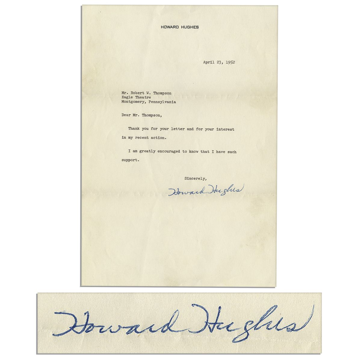 Howard Hughes typed letter signed. Dated 23 April 1952, McCarthyism era letter is a response to one Mr. Robert Thompson, who initiated the correspondence, sending a letter praising Hughes for his patriotism in acquiring RKO Pictures and firing suspected communist sympathizers. Letter on Hughes' personal stationery reads in full, ''Dear Mr. Thompson, Thank you for your letter and for your interest in my recent action. I am greatly encouraged to know that I have such support. Sincerely, [signed] Howard Hughes''. Accompanied by the original mailing envelope and a ticket to Thompson's movie theater. Single-page letter measures 7.25'' x 10.5''. Creasing and some smudging to verso, else near fine.