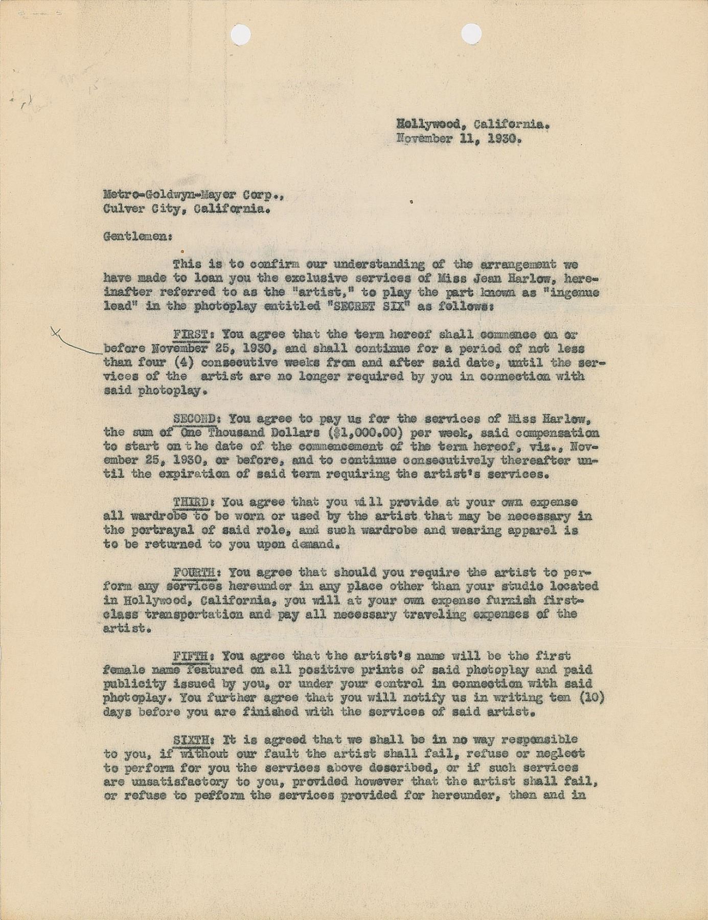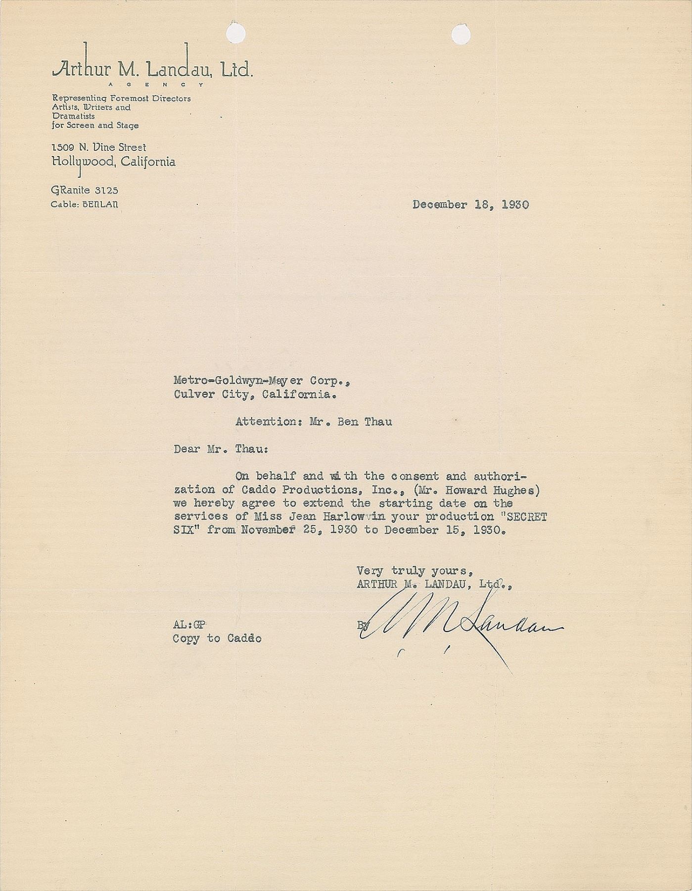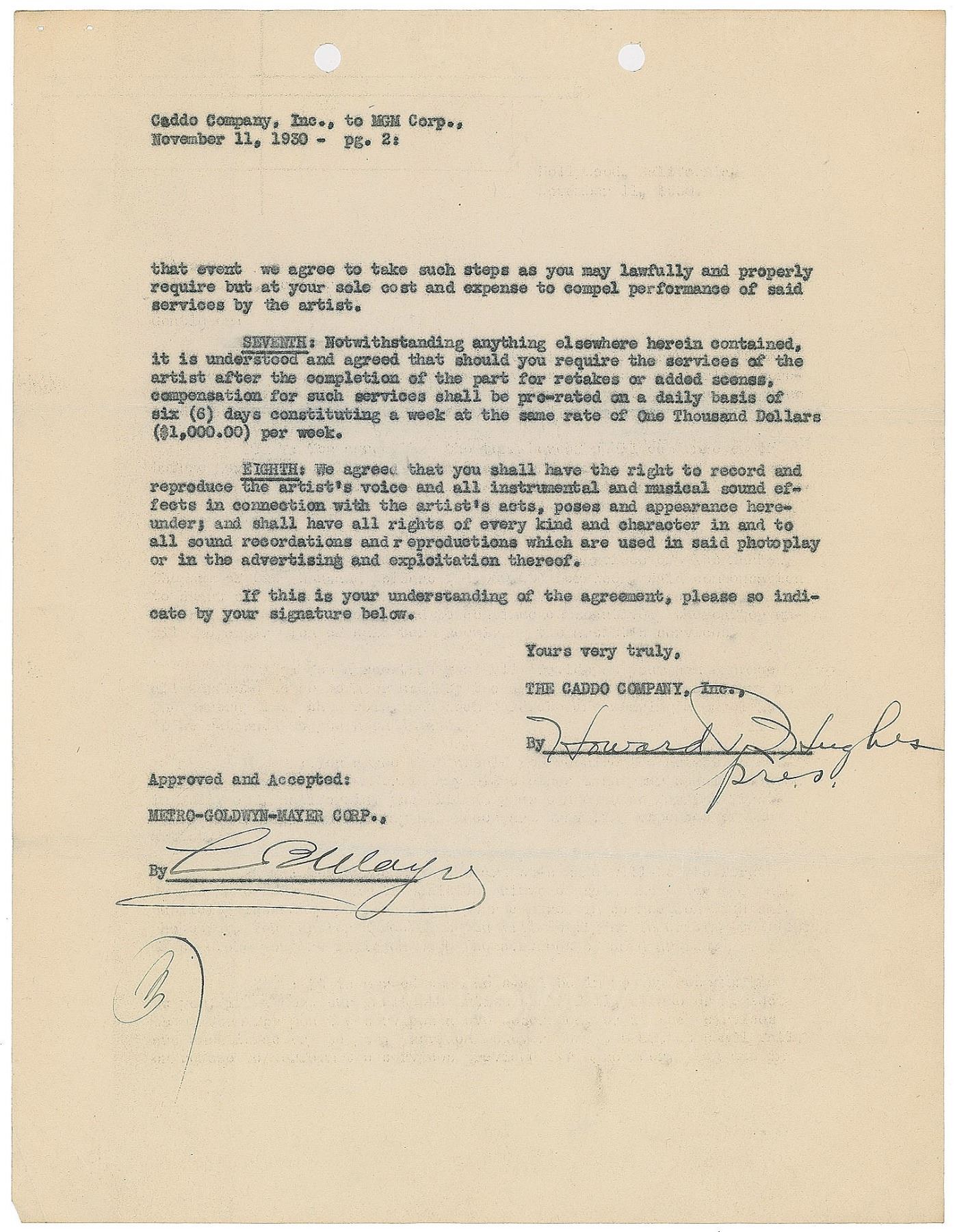 DS, signed “Howard R. Hughes, pres.,” two pages, 8.5 x 11, November 11, 1930. Agreement by which Hughes's Caddo Company loans Jean Harlow to Metro-Goldwyn-Mayer to appear in the classic crime film The Secret Six. In part: "This is to confirm our understanding of the arrangement we have made to loan you the exclusive services of Miss Jean Harlow…to play the part known as 'ingenue lead' in the photoplay entitled 'Secret Six.'" The document outlines the terms and schedule for the agreement. Signed at the conclusion in fountain pen by both Hughes and Louis B. Mayer. Includes a TLS by Arthur M. Landau, December 18, 1930, agreeing to "extend the starting date on the services of Miss Jean Harlow in your production 'Secret Six' from November 25, 1930, to December 15, 1930." In fine condition.