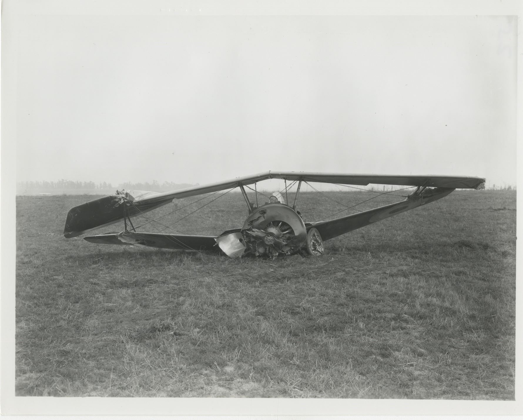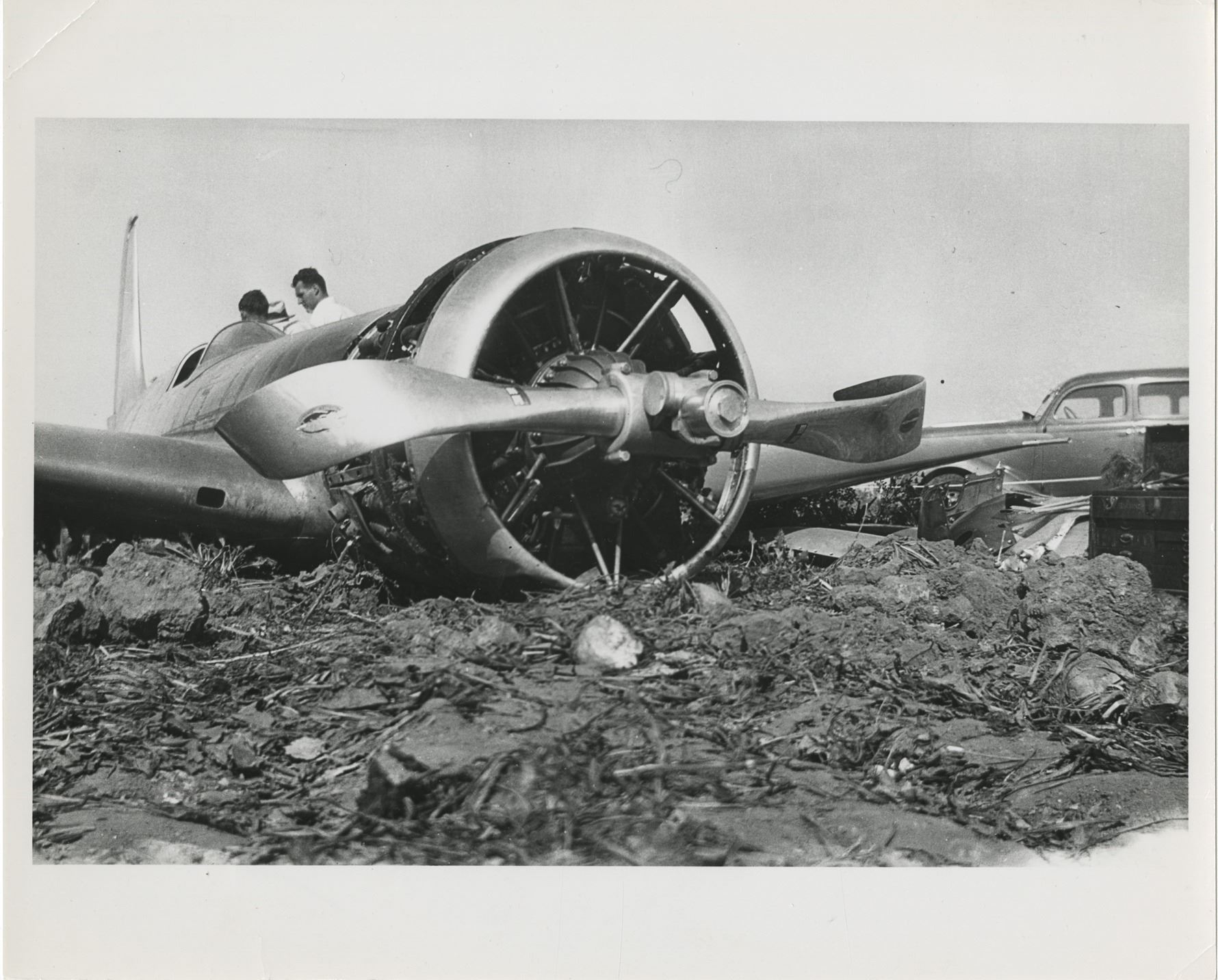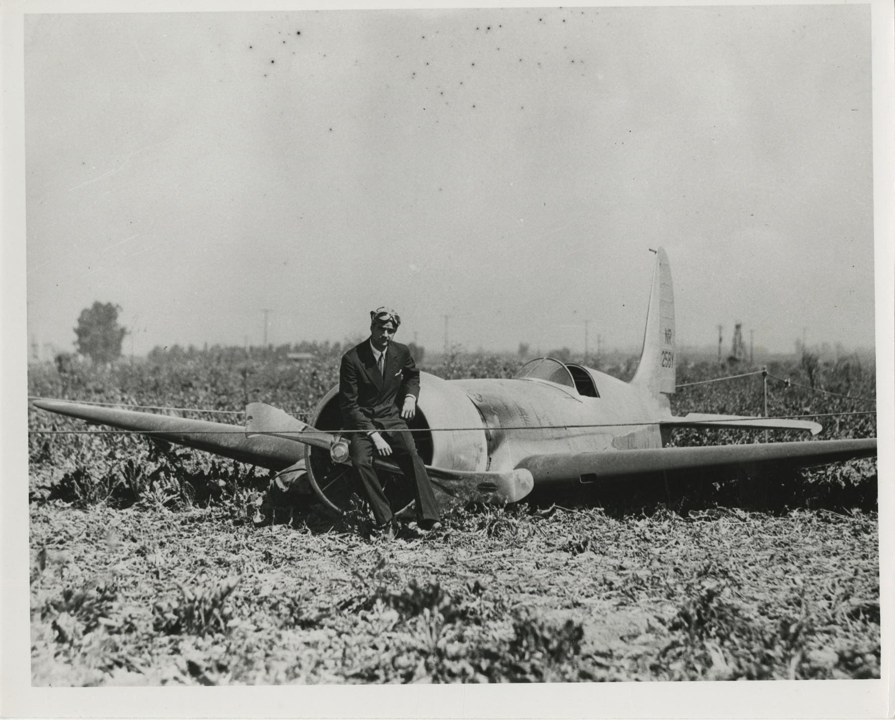 60. Howard Hughes collection of (10) personal photographs from his plane crashes. Collection of (10) gelatin silver 8 x 10 in. prints (mostly quality restrikes) depicting three high-profile plane crashes in which Howard Hughes was involved. Three images show the Thomas Morse Scout biplane crashed by Hughes in 1928 while attempting a low-level turn during the filming of Hell's Angels. Two images show the Hughes H-1 Racer after Hughes broke the landplane speed record in 1935 and ran out of fuel demanding him to force land in a plowed beet field. Another two images depict the Sikorsky S-43 piloted by Hughes that crashed into Lake Meade during a test flight. The final three images depict the crash scene in Beverly Hills where Hughes nearly lost his life during a test flight of the Hughes XF-11 spy plane on April 5, 1947. Exhibit handling with minor creasing. From the personal collection of Howard Hughes. $100 - $200