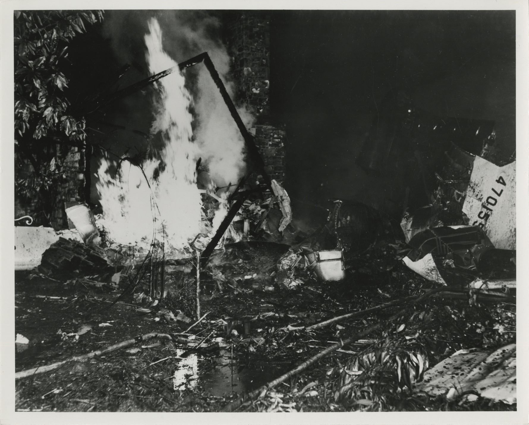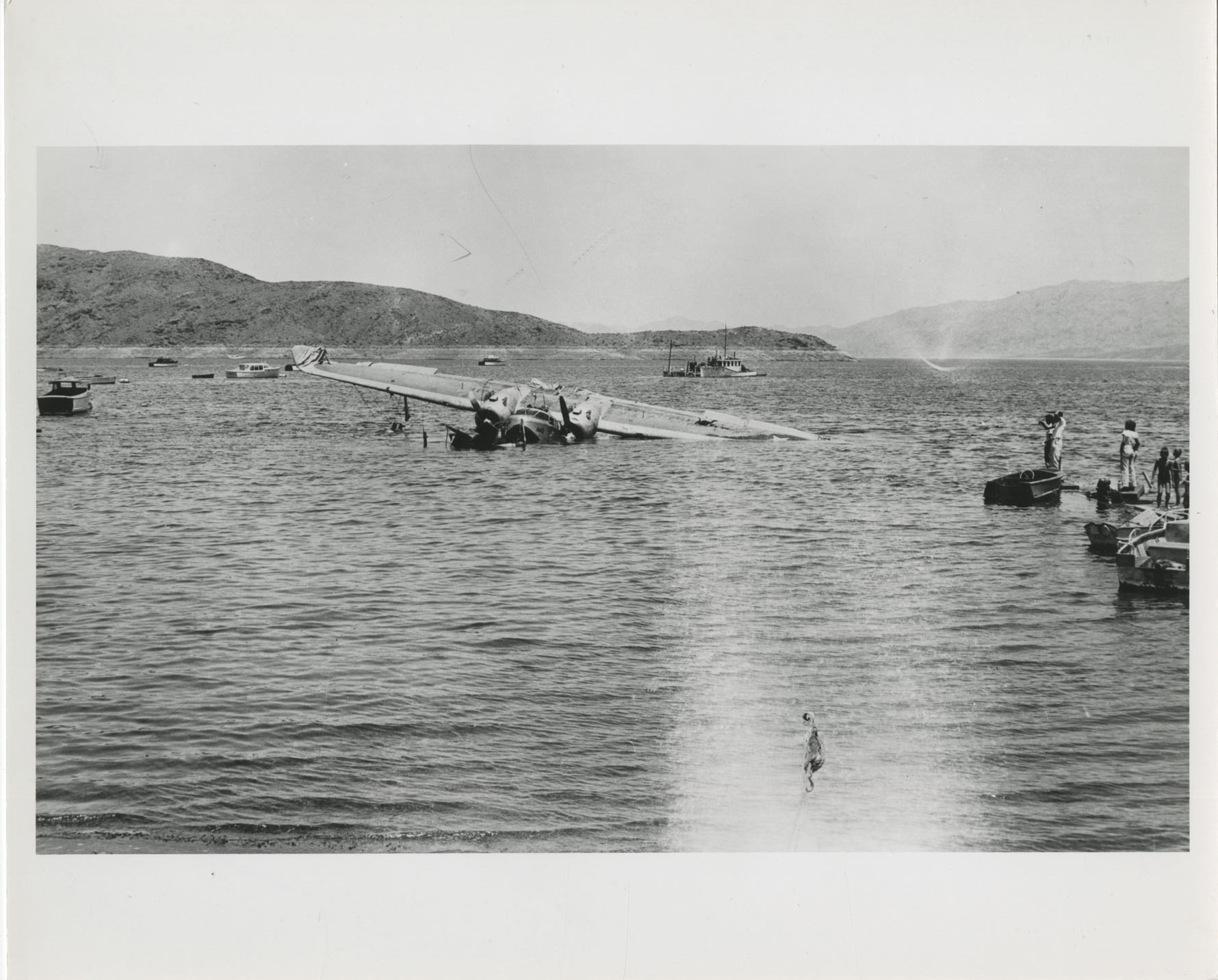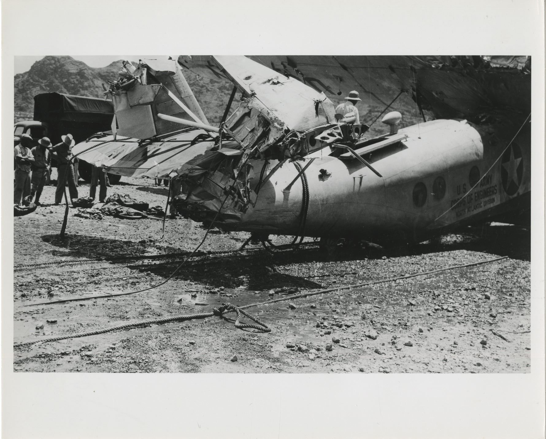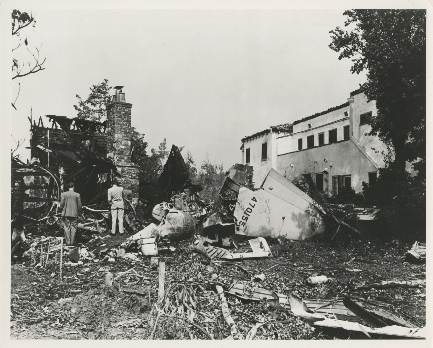 60. Howard Hughes collection of (10) personal photographs from his plane crashes. Collection of (10) gelatin silver 8 x 10 in. prints (mostly quality restrikes) depicting three high-profile plane crashes in which Howard Hughes was involved. Three images show the Thomas Morse Scout biplane crashed by Hughes in 1928 while attempting a low-level turn during the filming of Hell's Angels. Two images show the Hughes H-1 Racer after Hughes broke the landplane speed record in 1935 and ran out of fuel demanding him to force land in a plowed beet field. Another two images depict the Sikorsky S-43 piloted by Hughes that crashed into Lake Meade during a test flight. The final three images depict the crash scene in Beverly Hills where Hughes nearly lost his life during a test flight of the Hughes XF-11 spy plane on April 5, 1947. Exhibit handling with minor creasing. From the personal collection of Howard Hughes. $100 - $200