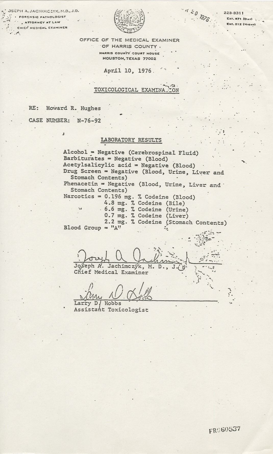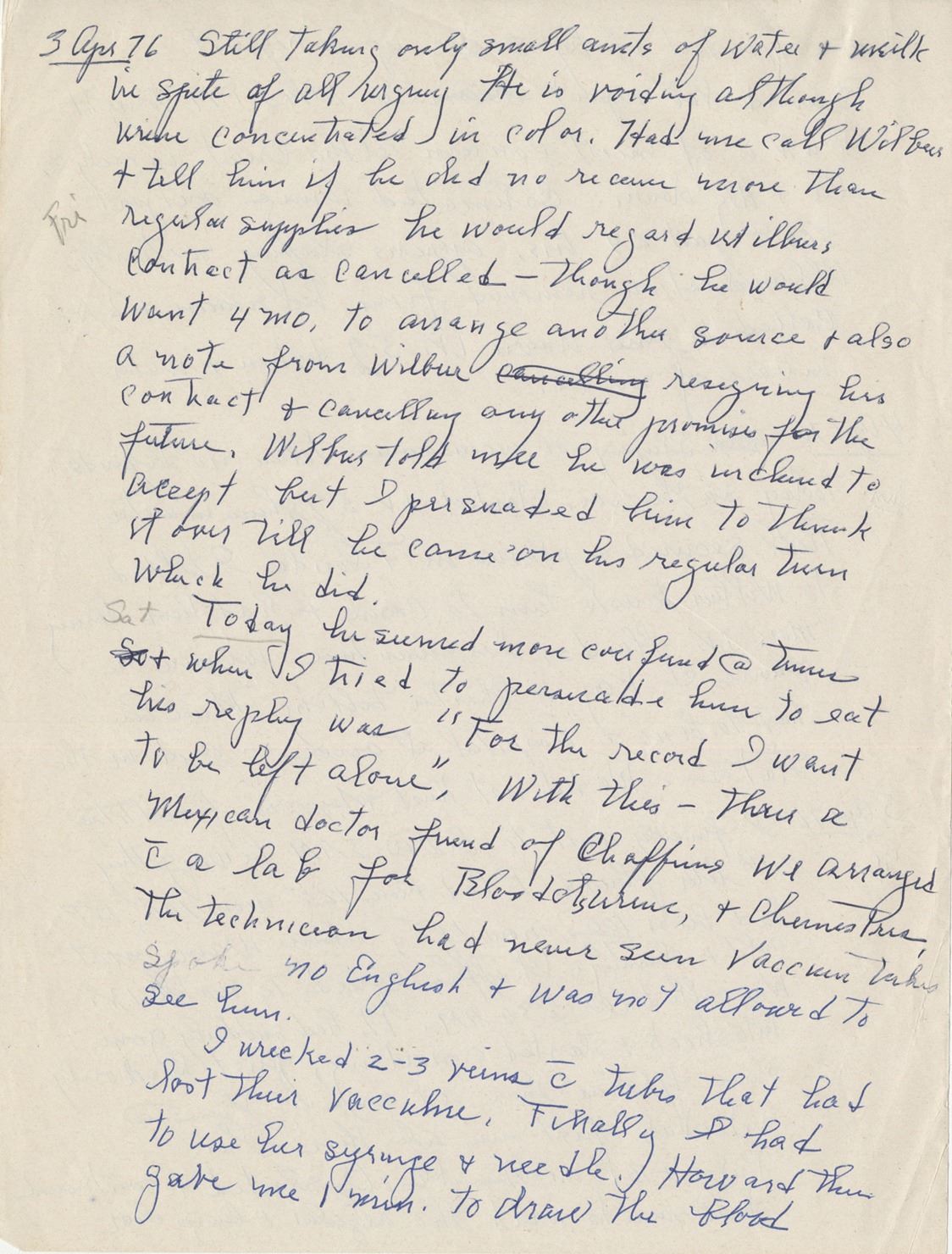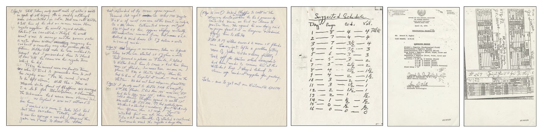 102. Howard Hughes handwritten medical notes detailing his final three days before death. 3 pages (on two 8.3 x 11 in. leaves) written, in ink, in the hand of Hughes' medical caregiver, dated "3 Apr 76" through "5 April 76". In part: "3 Apr 76 Still taking only small amts of water & milk in spite of all urgency. He is voiding although urine concentrated in color. [Hughes] Had me call Wilbur & tell him if he did no [sic] receive more than regular supplies he would regard Wilbur's contract as cancelled - though he would want 4 mo. To arrange another source & also a note from Wilbur resigning his contract & cancelling any other promises for the future...Today he seemed more confused @ times & when I tried to persuade him to eat his reply was "For the record I want to be left alone," then a Mexican doctor friend of [Hughes' physician, Doctor Lawrence] Chaffin's we arranged w/ a lab for blood & urine...the technician had never seen vacuum tubes spoke no English & was not allowed to see him. I wrecked 2-3 veins w/ tubes that had lost their vacuum. Finally I had to user her syringe & needle. Howard then gave me 1 min. to draw the blood, but extended it by 30 sec upon request....4 Apr 76 Sleeping - or unconscious, taken no liquids today so this eve. Started IV 5% Gluc. in water. Real secured a plane in Florida. I talked to Wilbur to ask him to come & had him bring more I.V. fluids. In meantime we were on phone w/ Kay & Chester telling them he had to be in a hospital at once - and in the States. We did not trust Mexican facilities. 5 Apr 76...Chaffin agreed to watch I.V. Was called @5:30 AM. Pt. [patient] had suddenly gone into shock & started convulsing, first head only, then lft [left] arm, then rt [right] arm...Pulse and BP [blood pressure] unobtainable. 02 [oxygen] started and continued heart sounds weak tho regular & lungs clear. Asked Chaffin to call in the Mexican doctor in consult whom he had previously contacted since we had no license to practice there. He agreed he was dying said no proper facilities in Acapulco & advised flying him to States. 8:30 AM Wilbur arrived w/ more I.V. fluids in a Lear Jet. After a problem getting more 02 John Wilbur & Larry finally took off for Houston where arrangements had been made to receive him at the Methodist Hospital... The reclusive 70-year-old billionaire was on the way from Acapulco, Mexico to Houston, Texas for emergency medical treatment when he died at 1:27 PM in a chartered Lear jet flying over south Texas. Includes 14-page photocopy of Hughes' Final Autopsy Report (dated April 6, 1976) and Toxicological Examination (dated April 10, 1976). Notes exhibit folds and surface wrinkling with minor paper chipping at left corner of second leaf. From the files of Howard Hughes. $200 - $300