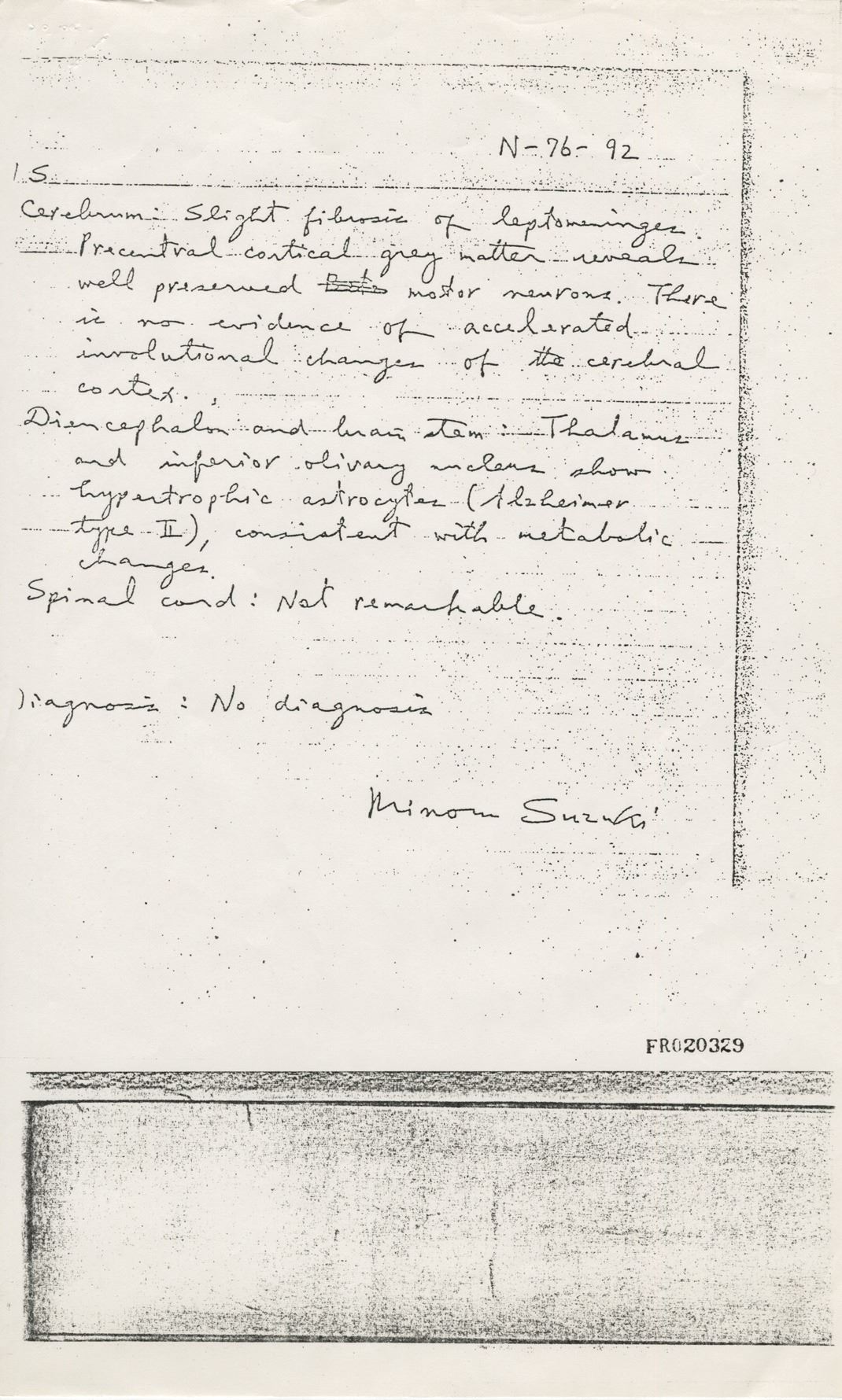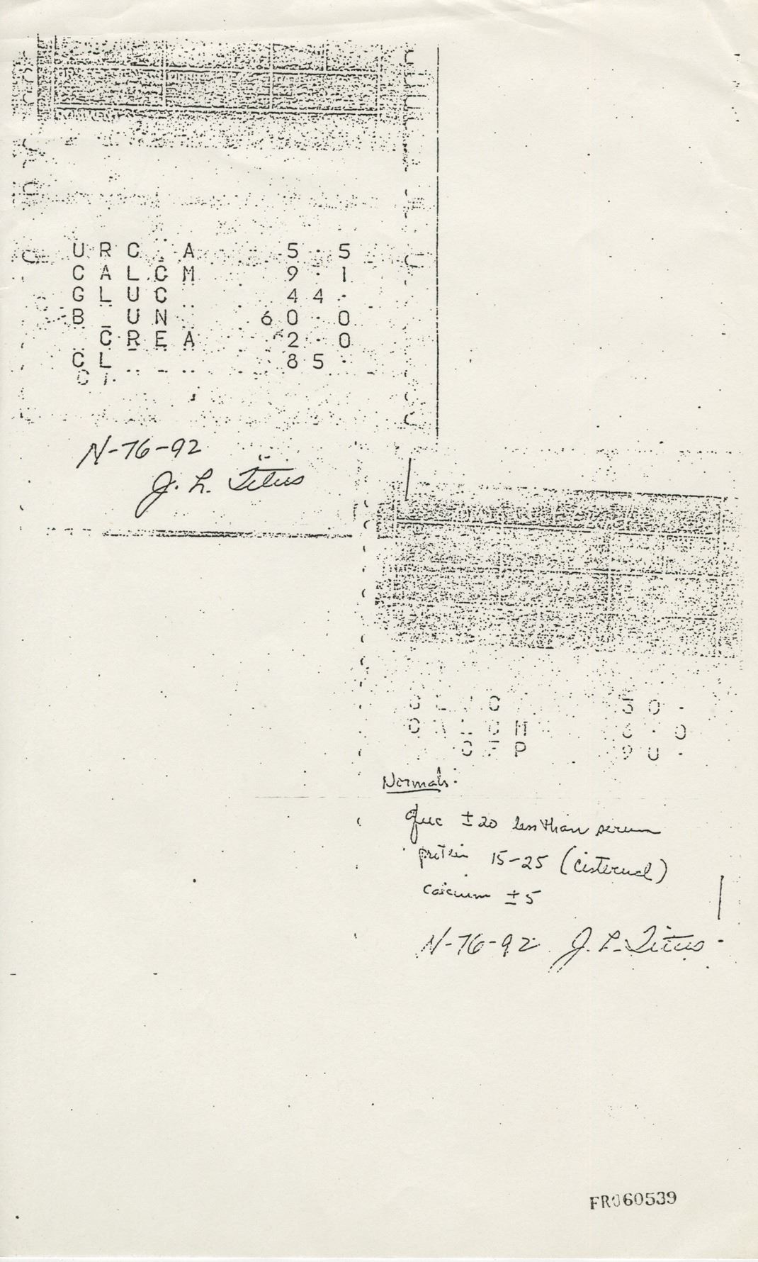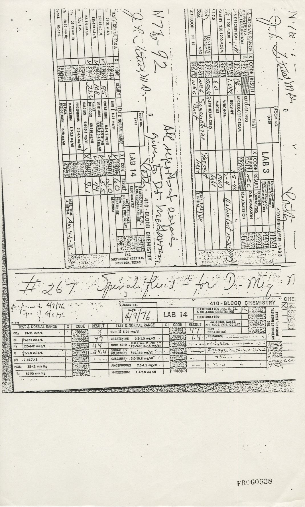 102. Howard Hughes handwritten medical notes detailing his final three days before death. 3 pages (on two 8.3 x 11 in. leaves) written, in ink, in the hand of Hughes' medical caregiver, dated "3 Apr 76" through "5 April 76". In part: "3 Apr 76 Still taking only small amts of water & milk in spite of all urgency. He is voiding although urine concentrated in color. [Hughes] Had me call Wilbur & tell him if he did no [sic] receive more than regular supplies he would regard Wilbur's contract as cancelled - though he would want 4 mo. To arrange another source & also a note from Wilbur resigning his contract & cancelling any other promises for the future...Today he seemed more confused @ times & when I tried to persuade him to eat his reply was "For the record I want to be left alone," then a Mexican doctor friend of [Hughes' physician, Doctor Lawrence] Chaffin's we arranged w/ a lab for blood & urine...the technician had never seen vacuum tubes spoke no English & was not allowed to see him. I wrecked 2-3 veins w/ tubes that had lost their vacuum. Finally I had to user her syringe & needle. Howard then gave me 1 min. to draw the blood, but extended it by 30 sec upon request....4 Apr 76 Sleeping - or unconscious, taken no liquids today so this eve. Started IV 5% Gluc. in water. Real secured a plane in Florida. I talked to Wilbur to ask him to come & had him bring more I.V. fluids. In meantime we were on phone w/ Kay & Chester telling them he had to be in a hospital at once - and in the States. We did not trust Mexican facilities. 5 Apr 76...Chaffin agreed to watch I.V. Was called @5:30 AM. Pt. [patient] had suddenly gone into shock & started convulsing, first head only, then lft [left] arm, then rt [right] arm...Pulse and BP [blood pressure] unobtainable. 02 [oxygen] started and continued heart sounds weak tho regular & lungs clear. Asked Chaffin to call in the Mexican doctor in consult whom he had previously contacted since we had no license to practice there. He agreed he was dying said no proper facilities in Acapulco & advised flying him to States. 8:30 AM Wilbur arrived w/ more I.V. fluids in a Lear Jet. After a problem getting more 02 John Wilbur & Larry finally took off for Houston where arrangements had been made to receive him at the Methodist Hospital... The reclusive 70-year-old billionaire was on the way from Acapulco, Mexico to Houston, Texas for emergency medical treatment when he died at 1:27 PM in a chartered Lear jet flying over south Texas. Includes 14-page photocopy of Hughes' Final Autopsy Report (dated April 6, 1976) and Toxicological Examination (dated April 10, 1976). Notes exhibit folds and surface wrinkling with minor paper chipping at left corner of second leaf. From the files of Howard Hughes. $200 - $300