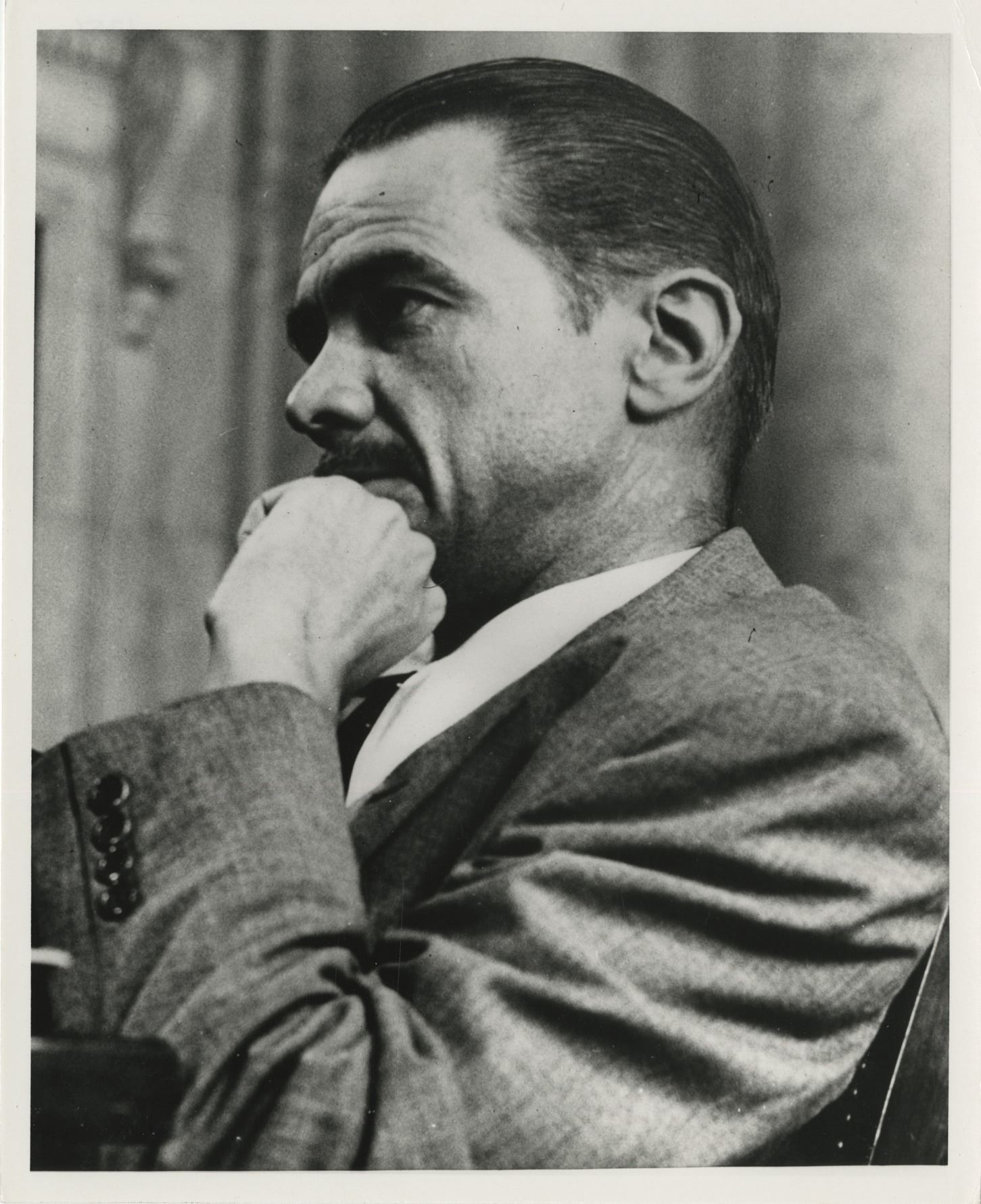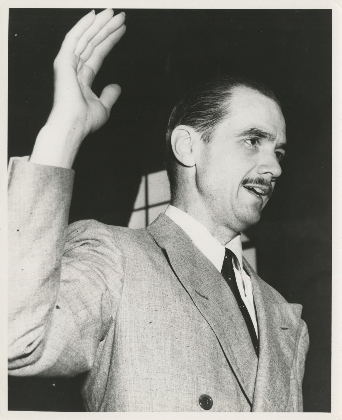 83. Howard Hughes personal (11) photographs testifying before the 1947 Senate War Investigating Committee. Collection of (11) gelatin silver 8 x 10 in. prints (mostly quality restrikes) taken of Hughes during his high profile Senate War Investigating Committee hearing of August 1947. Despite his company's poor performance on government contracts during the war, Hughes emerged from the hearings, and in public opinion, as a persecuted aviation hero. Exhibiting some handling with minor creasing. From the personal collection of Howard Hughes. $100 - $200