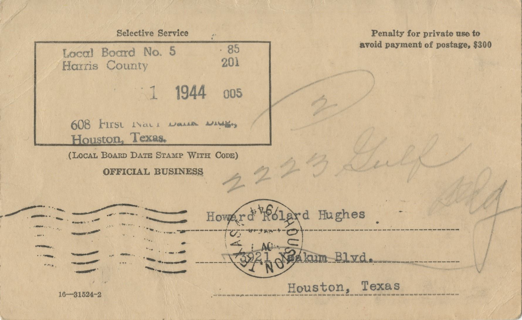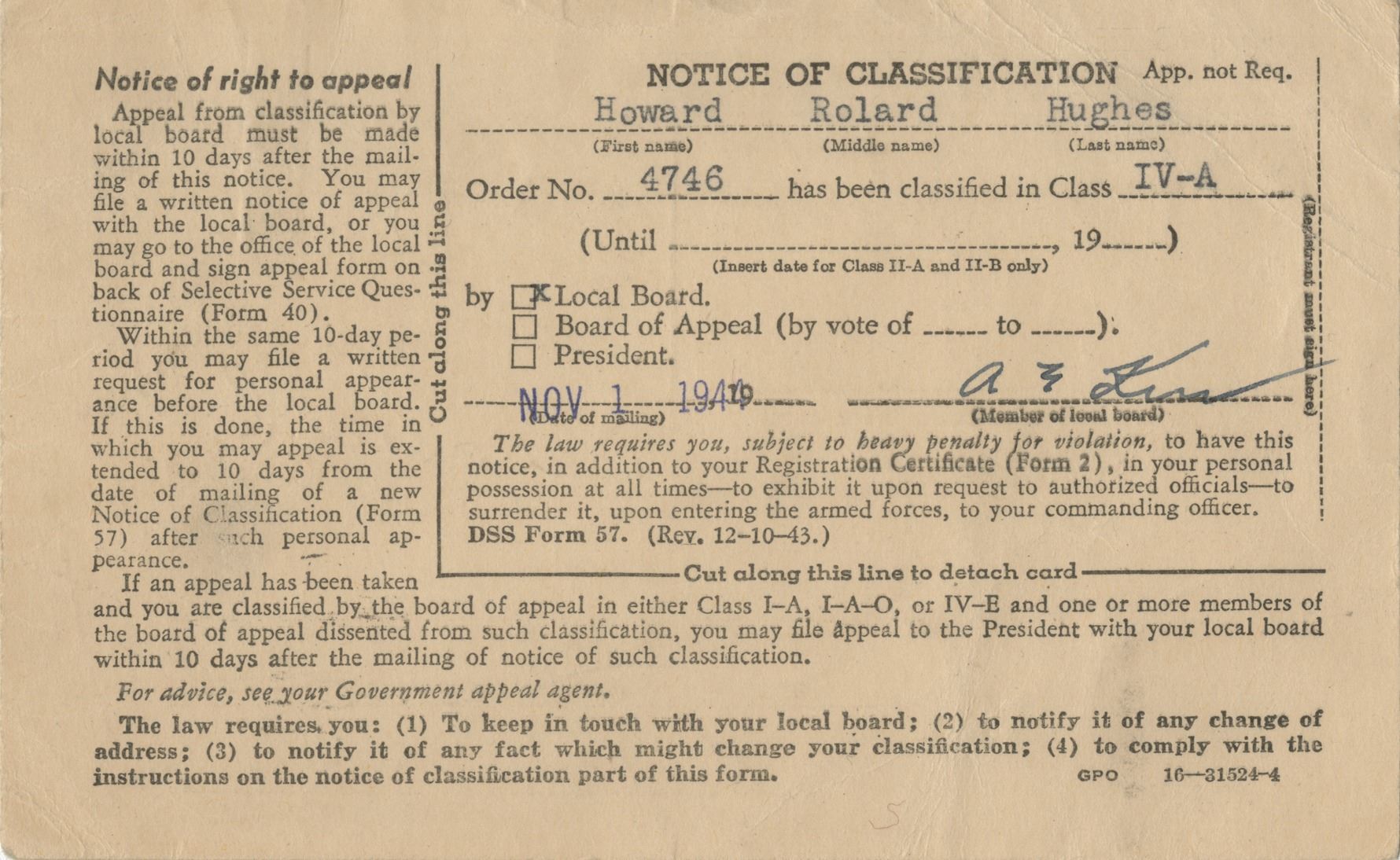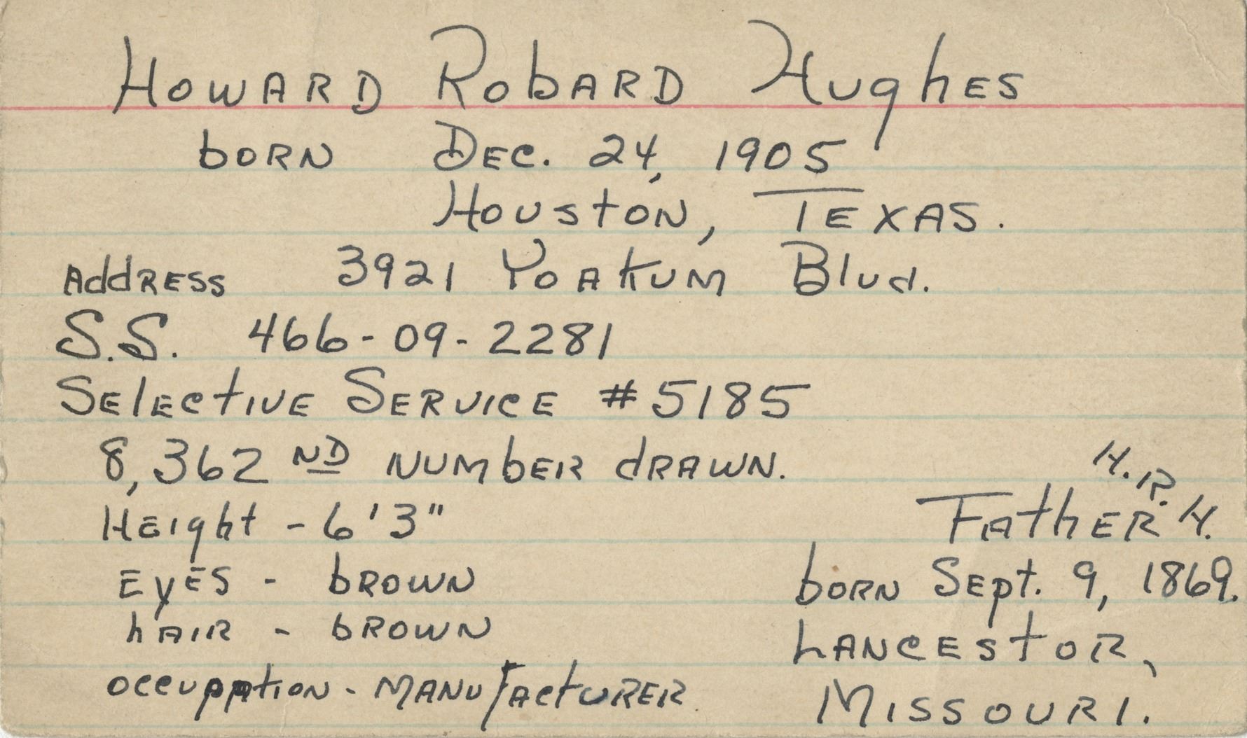 69. Howard Hughes personal Selective Service card and handwritten card of vital information. 5.5 x 3.25 in. Selective Service "Notice Of Classification" card for "Howard Rolard [sic] Hughes", Order No. "4746" being classified in Class "IV-A" date stamped "Nov 1 1944". Hughes' address is listed as 3921 Yoakum Blvd. / Houston, Texas". Accompanied with 5 x 3 in. index card completed in ink by Hughes, "Howard Robard Hughes / born Dec. 24, 1905 / Houston, Texas / Address 3921 Yoakum Blvd. / S.S. 466-09-2281 / Selective Service 5185 / 8,362nd Number drawn. / Height - 6'3' / Eyes - brown / hair - brown / occupation - Manufacturer / Father H.R.H. / born Sept. 9, 1869. / Lancestor, Missouri." Both cards exhibit handling with minor creasing. From the personal collection of Howard Hughes. $300 - $500