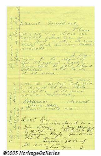 <B>Howard Hughes to Wife Jean Peters "Forgive My 'Hors de Combat' Condition"</B></I> They lived in separate rooms during their 14 years of marriage, communicating mostly through handwritten memos such as the one offered here. On a sheet from a yellow legal pad, undated (but likely mid-1960s), Hughes writes: <I>"Dearest Sweetheart, Please forgive my hors de combat condition of the past week. I was truly sick in my lower innards. I promise to do some of the things I have permitted to fall behind schedule - and to do it at once. I love you an awful lot, and I'll not be too late tonight. I'll send you a message, Howard. Please write me."</B></I> The French phrase he uses, <I>hors de combat,</B></I> means "out of action" or disabled. Jean responds with: <I>"Dearest Love - I understand and I'm sorry - I am going to watch #9 - "The Gentle Art of Murder" Maybe you would like to see it? - Anyway I'll be up till 12:00 - 1:00 - I love you - J."</B></I> The Hughes writing on the verso of this page doesn't seem to follow the preceding exchange. In it he talks about a movie he's seen "100 times" with Walter Brennan, Dana Andrews and Anne Baxter. Though not mentioned by title, he is referring to <I>Swamp Water</B></I> (1941). A fascinating look into the thoughts and actions of one the world's richest men. Fine condition, transcript included. <I>Accompanied by COA from PSA/DNA.</B></I> Lot:254