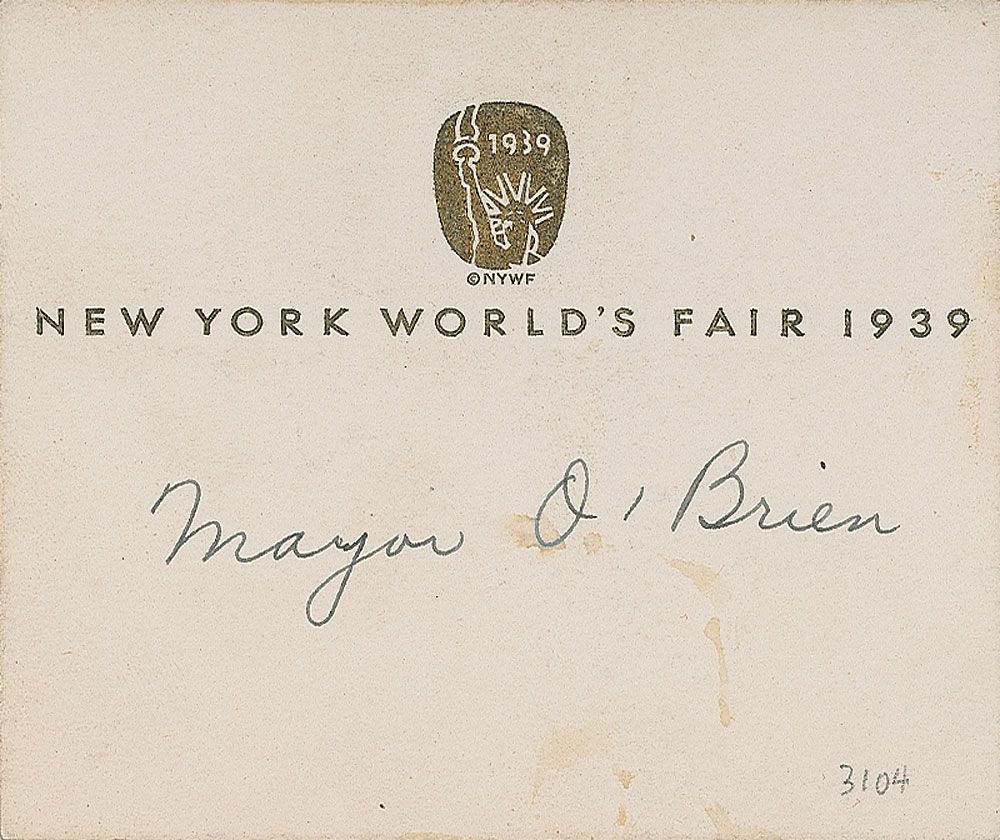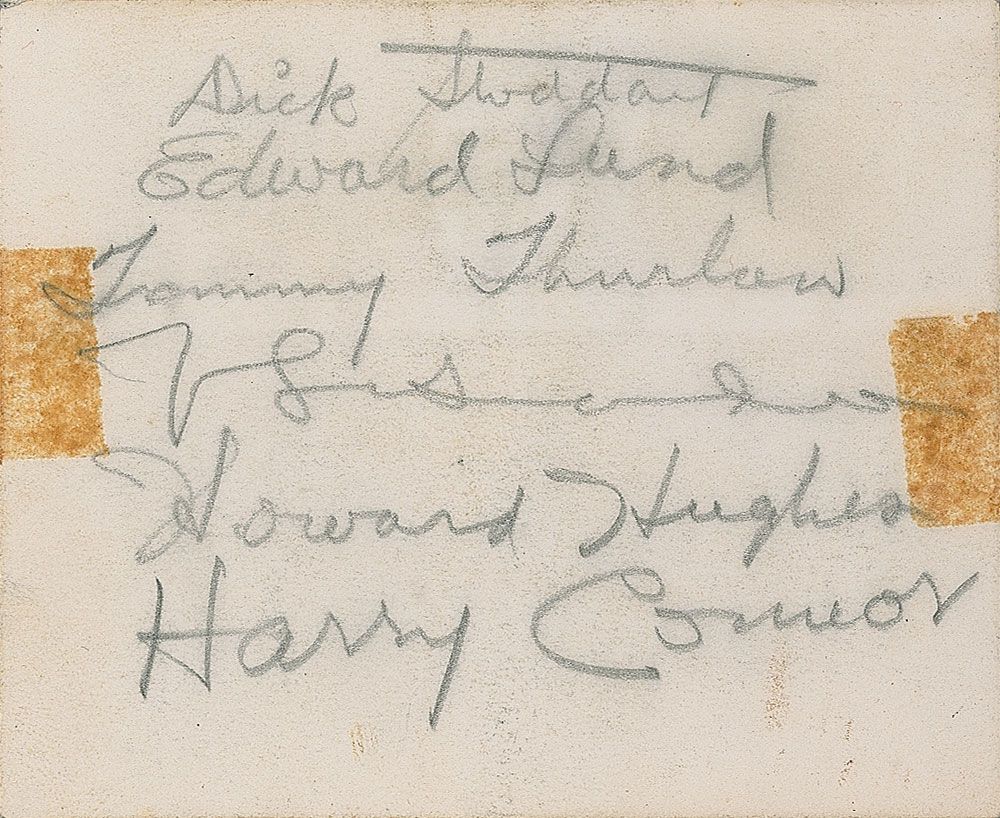 Vintage pencil signature, “Howard Hughes,” on the reverse of an off-white 3.5 x 2.75 1939 New York World’s Fair card. Card is also signed by around-the-world flight crew members Harry Connor, Tommy Thurlow, Edward Lund, Dick Stoddart, and Fiorello LaGuardia. Old tape to vertical edges touching a couple letters of signatures and a bit of scattered light soiling, other wise fine condition.