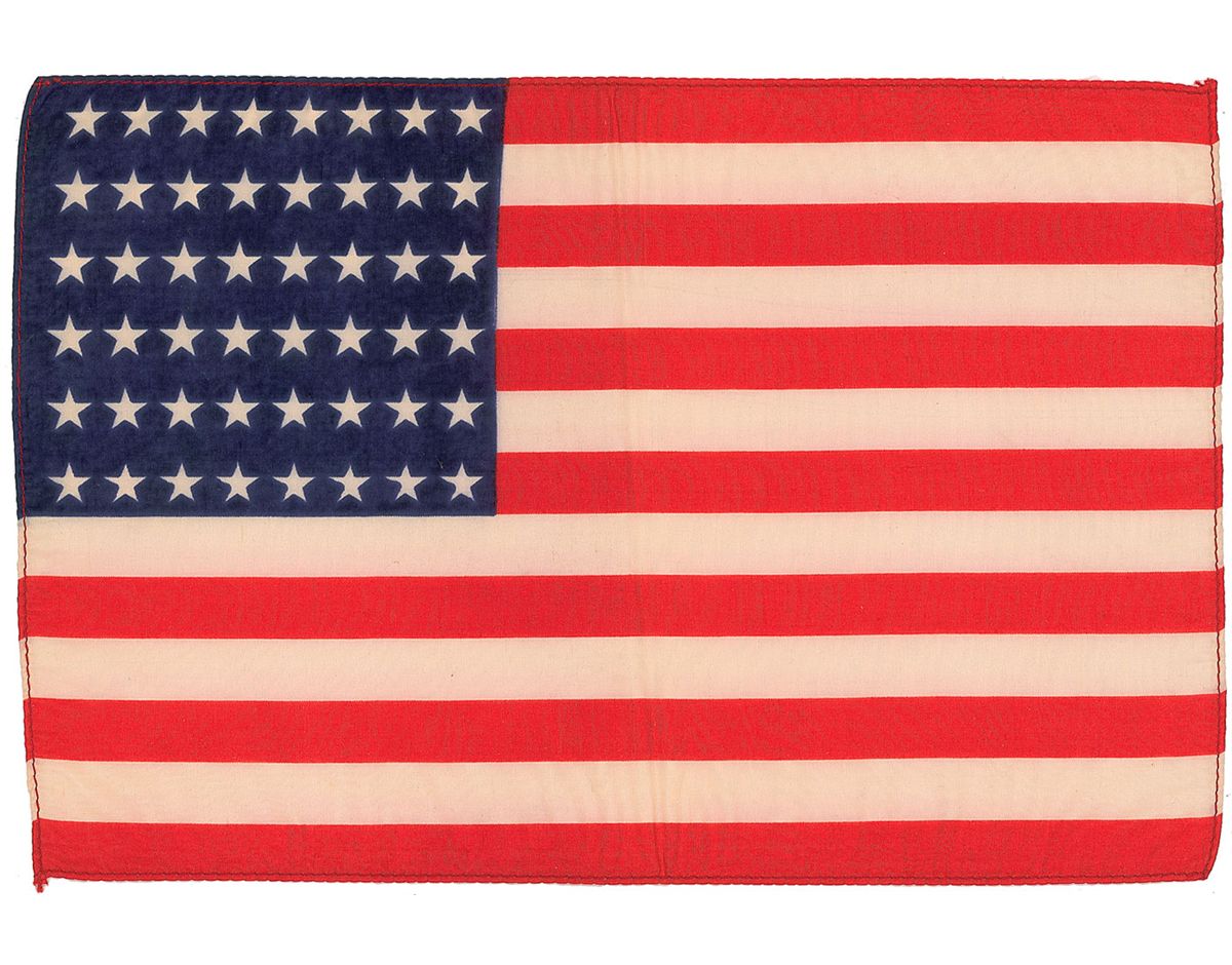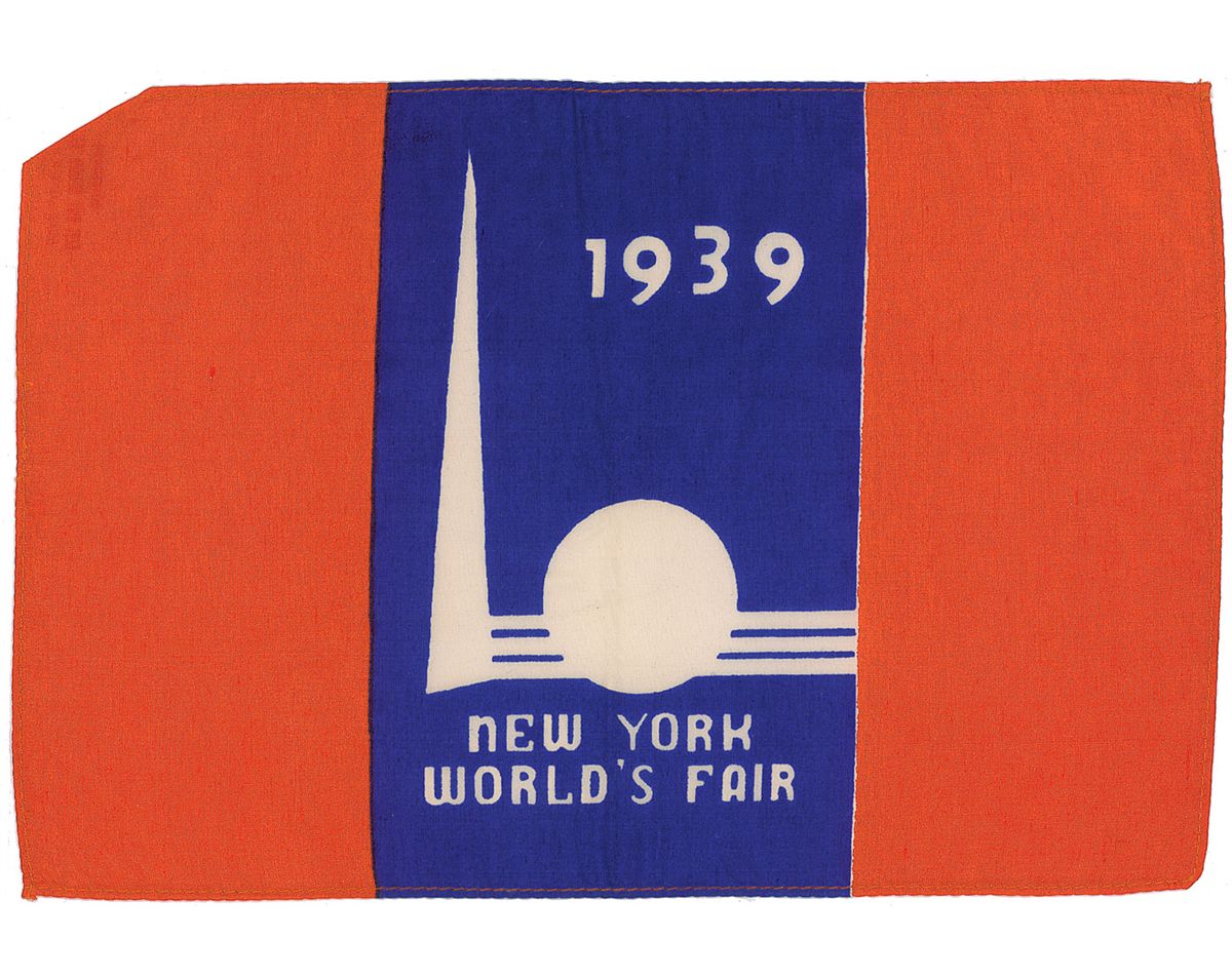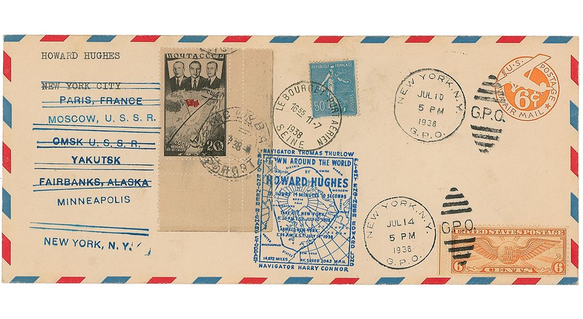 Scarce commemorative airmail postal cover, 9.5 x 4, carried by Hughes on his triumphant 1938 around-the-world flight. The cover, issued in conjunction with the 1939 New York World’s Fair, bears several postage stamps, postmarks, and rubber stamps indicating the primary stops on the record-setting journey: Paris, Moscow, Omsk, Yakutsk, Fairbanks, Minneapolis, and the final destination, New York City; and two flown printed fabric flags, both 11.75 x 8, one American flag and one 1939 New York World’s Fair flag. Accompanied by a color copy of a mailing envelope addressed to Hughes Aircraft from Annin and Co., manufacturers of flags and banners, with notations in an unknown hand reading, “Hughes. Flags AM carried & Hughes on round the world flight.” In fine condition.