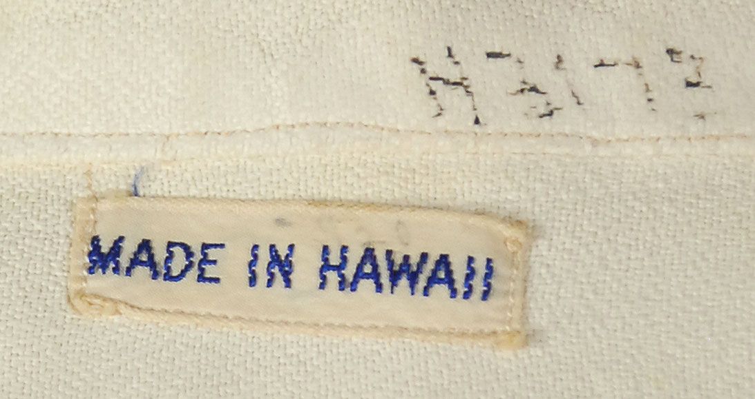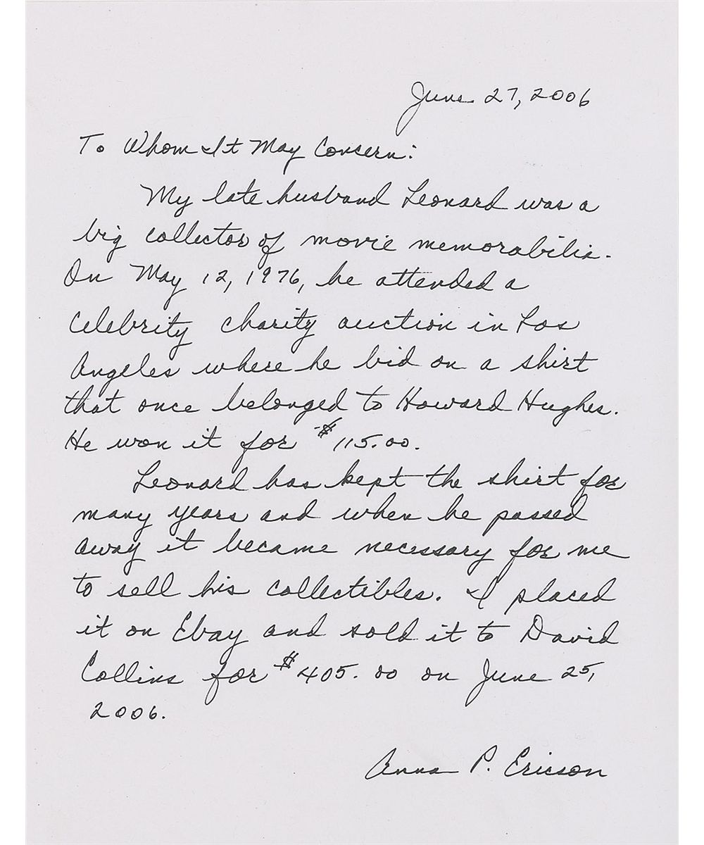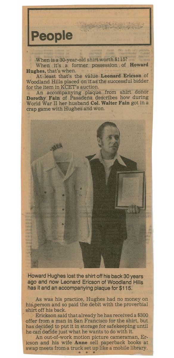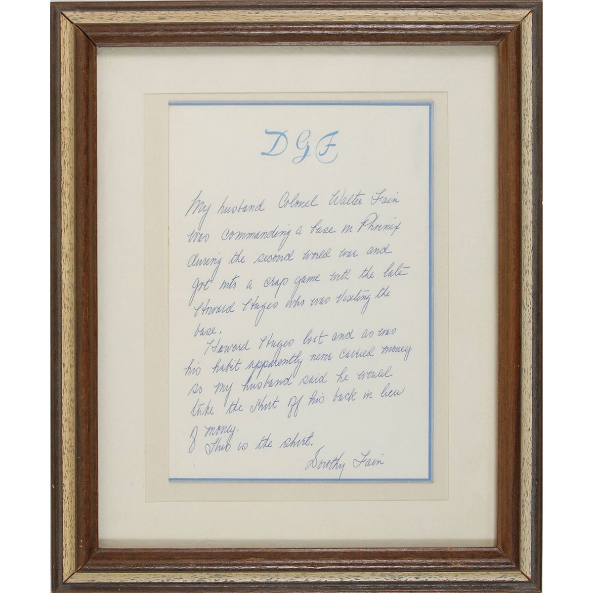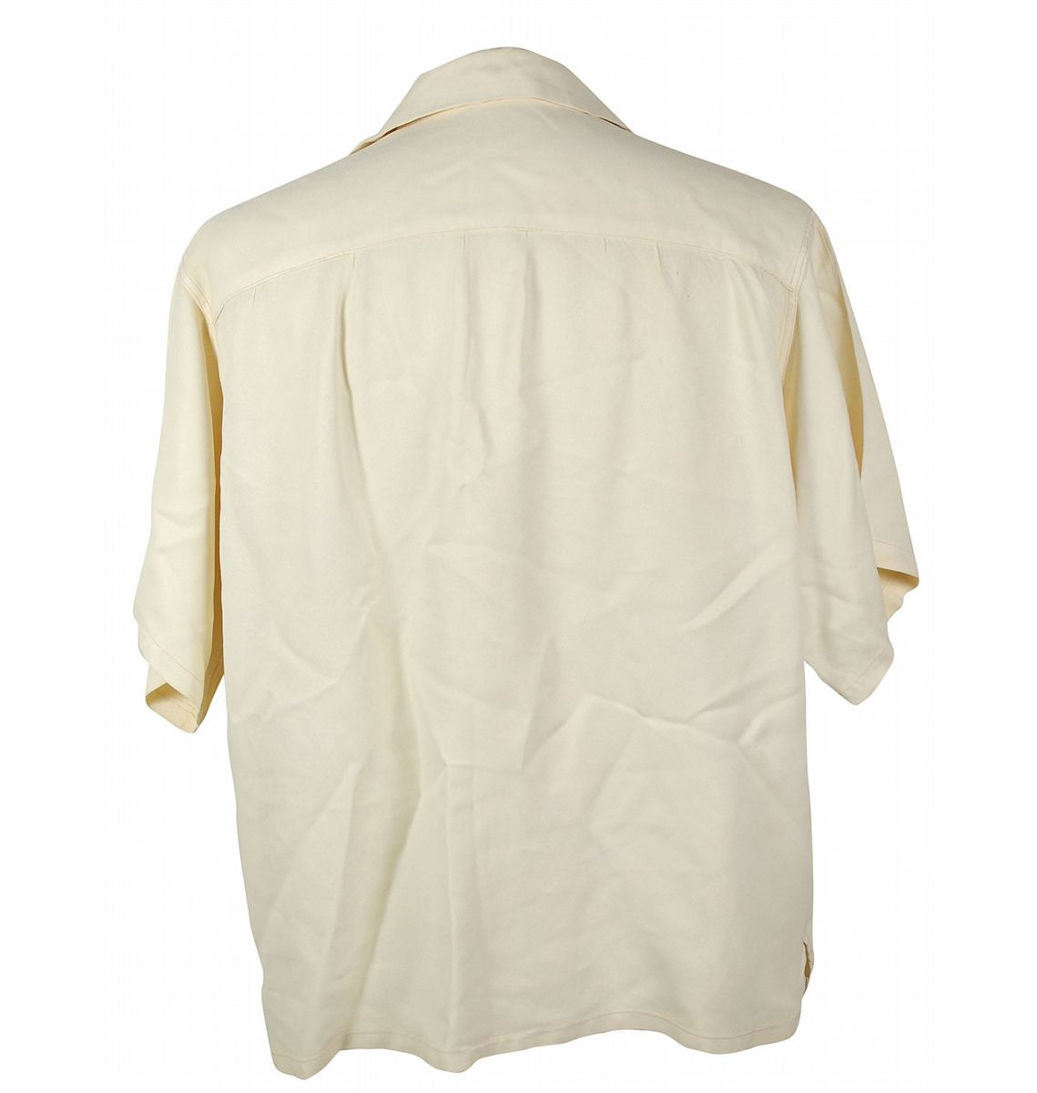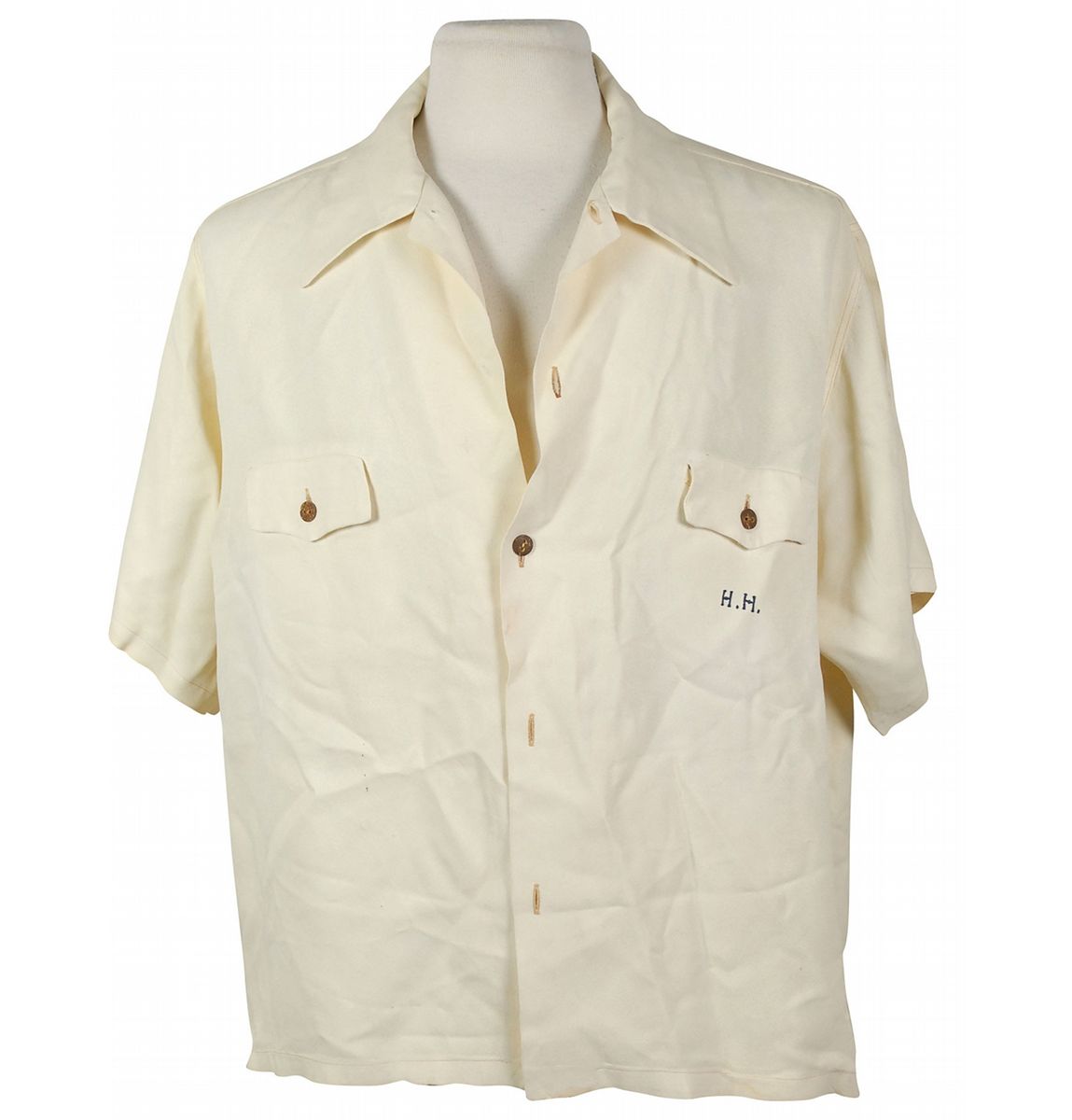 Hughes’s personally-owned and -worn shirt. Off-white short-sleeve shirt features a button-up front, and is monogrammed “H. H.” on the left breast pocket. A small label sewn into the collar reads “Made in Hawaii,” with a small ink notation above the collar. Accompanied by a letter of provenance from Dorothy Fain, which reads, in full: “My husband Colonel Walter Fain was commanding a base in Phoenix during the second world war and got into a crap game with the late Howard Huges [sic] who was visiting the base. Howard Huges [sic] lost and as was his habit apparently never carried money so my husband said he would take the shirt off his back in lieu of money. This is the shirt.” Also accompanied by a 1976 news clipping regarding the sale of the shirt at a KCET television auction. In fine condition, with all but one of the buttons missing. An interesting and very personal item from the billionaire, with equally interesting provenance.