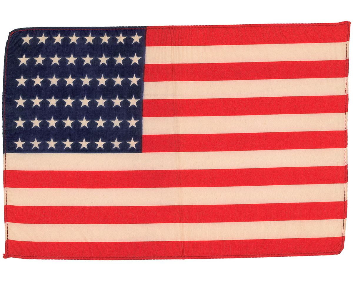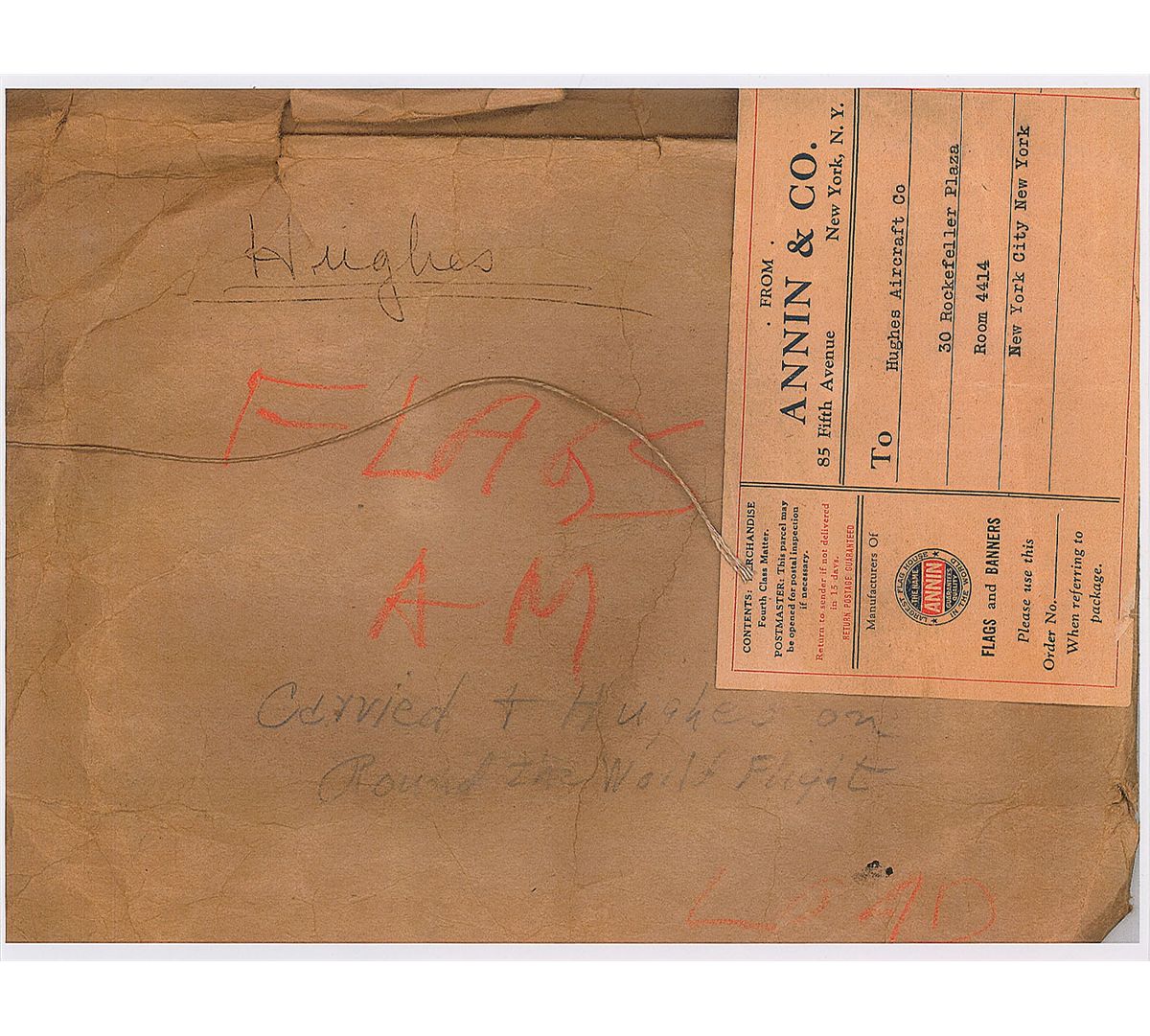 Scarce commemorative airmail postal cover, 9.5 x 4, carried by Hughes on his triumphant 1938 around-the-world flight. The cover, issued in conjunction with the 1939 New York World’s Fair, bears several postage stamps, postmarks, and rubber stamps indicating the primary stops on the record-setting journey: Paris, Moscow, Omsk, Yakutsk, Fairbanks, Minneapolis, and the final destination, New York City; and a flown fabric American flag, 12 x 8, carried on the flight. Accompanied by a color copy of a mailing envelope addressed to Hughes Aircraft from Annin and Co., manufacturers of flags and banners, with notations in an unknown hand reading, “Hughes. Flags AM carried & Hughes on round the world flight.” In fine condition. Accompanied by a certificate of authenticity from University Archives. In 1938, Hughes set a new around-the-world record of 3 days, 19 hours and 8 minutes. The flight took off on July 10 from an airfield on Long Island, New York, in a specially designed Lockheed 14N ‘Super Electra’ aircraft with a range of nearly 5,000 miles, making stops in the aforementioned cities.